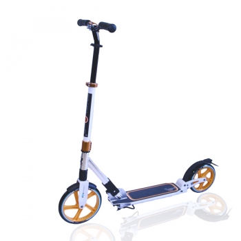 Мощный городской самокат Olimp SKL-033 подходит детям и взрослым. Алюминиевая рама выдерживает нагрузку до 100 кг. Складной механизм и плечевой ремешок облегчает перевозку самоката на общественном транспорте. Высота руля настраивается в трех позициях (от 79 до 97 см). Спереди установлено большое колесо диаметром 230 мм, сзади - 180 мм. На них установлены быстрые подшипники ABEC 7. Для парковки предусмотрена складная подножка. Вес - 6 кг.