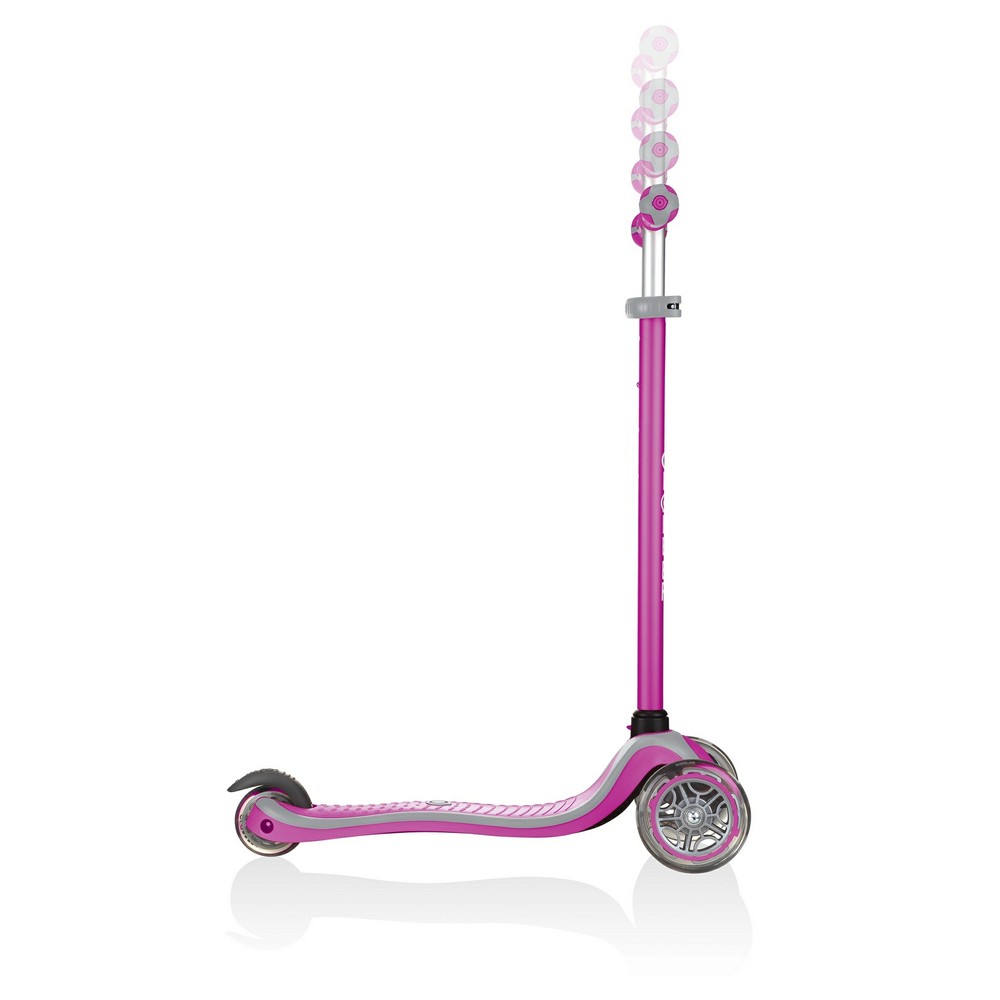 Globber Primo Plus Lights - потрясающий трехколесный самокат, рассчитанный на райдеров возрастом от 3-х лет. Устойчивая и легкоуправляемая конструкция способствует быстрому обучению. Дека изготовлена из двухкомпонентного армированного нейлона (размер 12х32 см), трехпозиционный руль регулируется по высоте от 67,5 до 77,5 см и снимается для хранения, грипсы выполнены из мягкой термопластичной резины. Колеса светятся при катании, выполнены из полиуретана, диаметр 121/80 мм, жесткость 82А, подшипники ABEC 5. Ограничение угла поворота с помощью фронтальной кнопки, чтобы самокат катился только прямо. Тормоз - ножной. Максимальная нагрузка: 50 кг. Цвет: голубой, зеленый, красный, розовый. Вес - 2,2 кг.