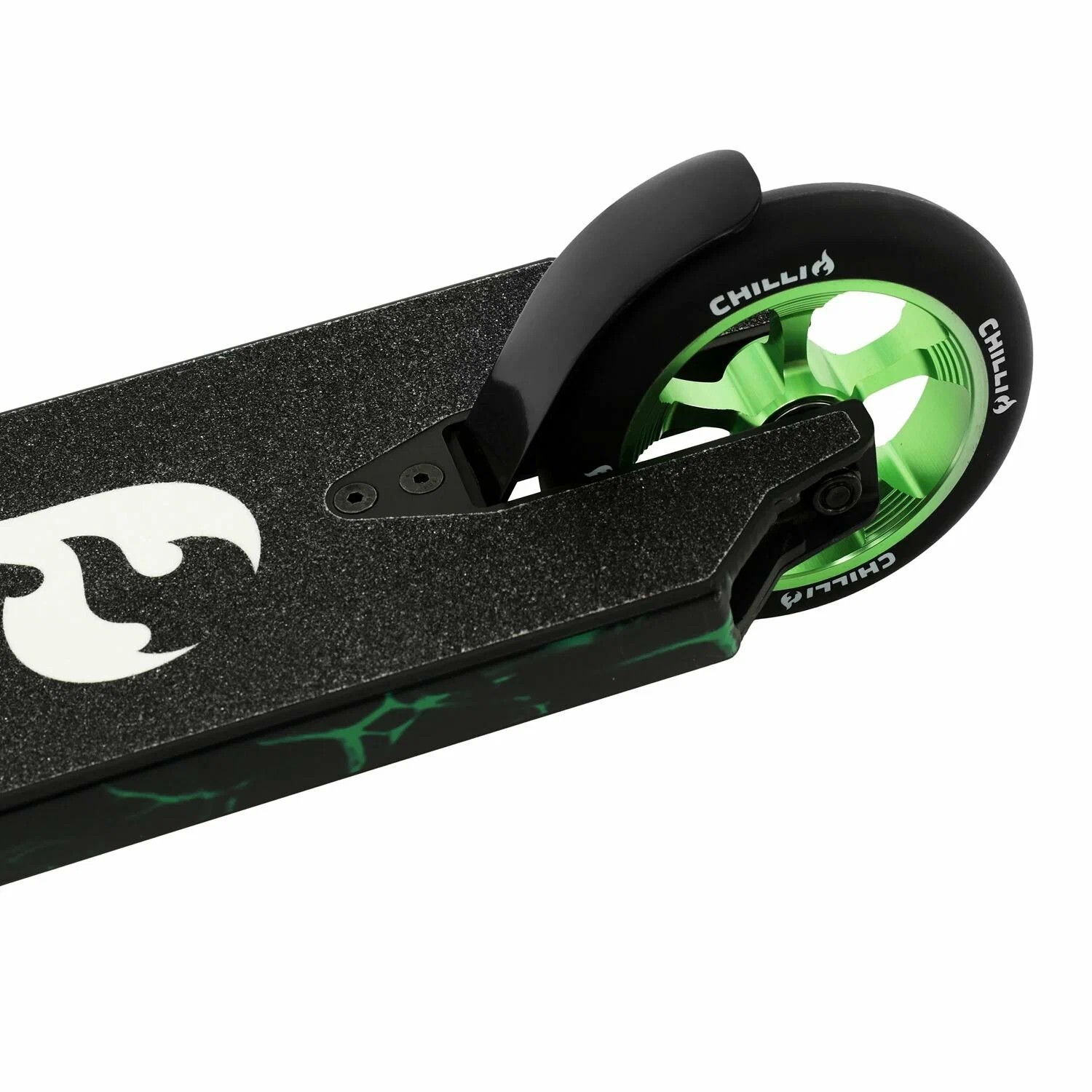 Chilli Pro Scooter Reaper Reloaded V2 Green (117-21) - это идеальный выбор для тех, кто любит экстремальные трюки на самокатах. Алюминиевая дека шириной 12,5 см позволяет легко скользить по граням, а усиленная задняя часть обеспечивает дополнительную прочность при выполнении сложных трюков. Колеса диаметром 120 мм с алюминиевым сердечником обеспечивают отличное ускорение, а Т-образная рулевая стойка из хромолевого сплава обеспечивает прочность и надежность во время катания. Дизайн скутера дополняют уникальные элементы: двухцветные грипсы, фрезерованный ажурный узор на зажиме и вилке, рисунок водной глади на деке. Этот самокат не только подарит вам незабываемые впечатления, но и стильным спутником для ваших трюковых выступлений. T-образная рулевая стойка должна располагаться на высоте вашего пупка или немного выше, тогда вы полностью готовы к невероятным трюкам и новым достижениям! Технические особенности модели: • алюминиевая рама (6061 Aluminum) • антискользящая поверхность деки • размеры деки 50 х 12.5 см • легкая алюминиевая вилка (7005 Aluminum) • система компрессии Chilli Spider HIC • Т-образный стальной руль (размеры 60 х 60 см) • высота руля 77 см от деки и 85 см от земли • двухцветные грипсы (TPE Rubber) • двухболтовый зажим из алюминия • полиуретановые колеса 120 мм (PU 88A) • алюминиевые диски Spoked (спицевые) • подшипники ABEC 9 • торможение задним крылом • максимальная нагрузка до 100 кг. Самокат подходит для пользователя ростом от 140 до 170 см