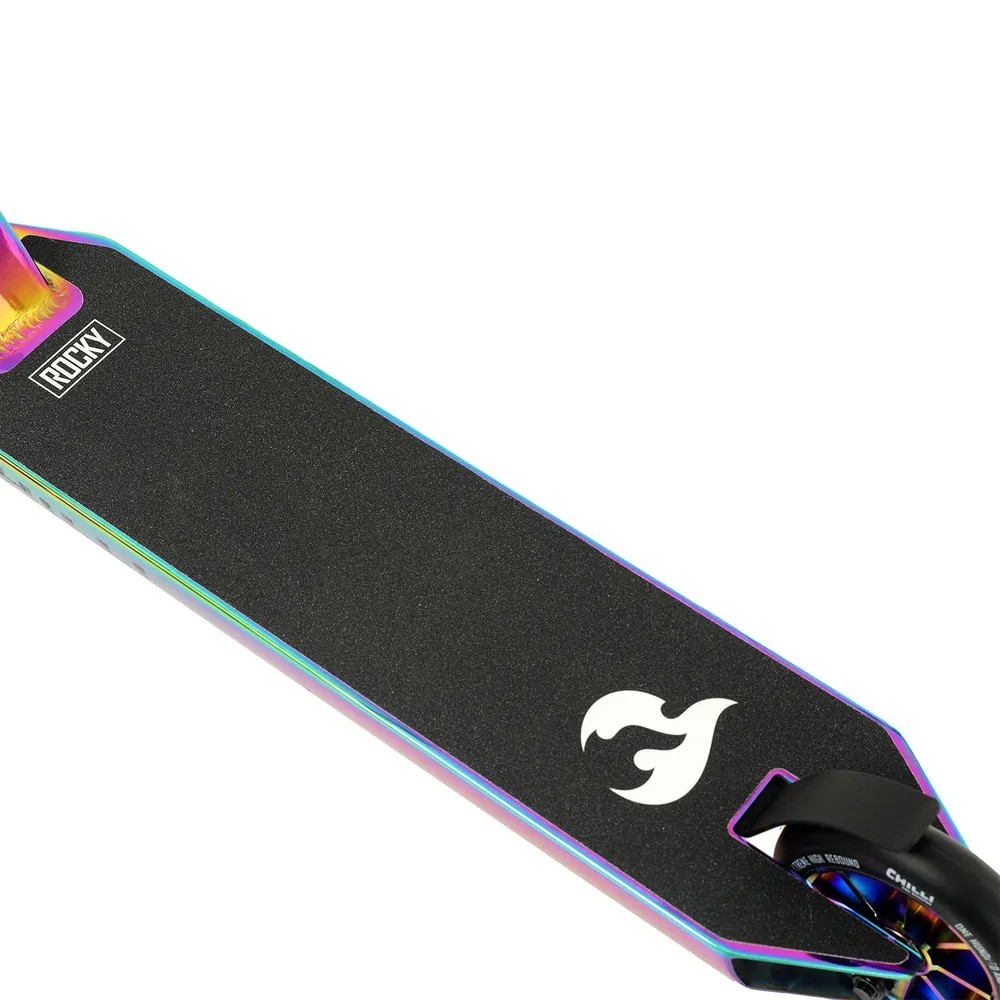 Chilli Pro Scooter Rocky Vol. 2 Black Neochrome (118-20) - трюковой самокат любительского уровня, который стал еще более стильным благодаря матовой неохромной отделке. Этот самокат изготовлен из лучших материалов по доступной цене, что делает его идеальным выбором для новичков всех возрастов. Алюминиевая дека длиной 50 см и шириной 11,5 см обеспечивает устойчивость и надежную опору во время трюков. Универсальная система компрессии HIC позволяет снизить вес самоката до минимума, что делает его маневренным и легким в управлении. Колеса диаметром 110 мм с высоким отскоком и подшипниками ABEC 9 обеспечивают отличное качество и плавное катание. Chilli Pro Scooter Rocky Vol. 2 Black Neochrome - идеальный выбор для тех, кто ценит стиль, качество и надежность в трюковом самокате. T-образная рулевая стойка должна располагаться на высоте вашего пупка или немного выше, тогда вы полностью готовы к невероятным трюкам и новым достижениям!