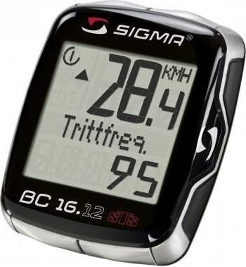 Sigma 1200 Baseline. Имеет 12 функций, среди которых: измерение скорости, пробега за день и общего пробега, максимальной скорости, общего времени в пути, средней скорости. Измеряет время в пути (авт. "старт/стоп"). Имеет часы, секундомер, способен сравнивать скорости и выбирать язык. 2 различные размера колеса. Велокомпьютер предназначен для крепления на руль или вынос с помощью резинового кольца. Датчик крепится на вилку.