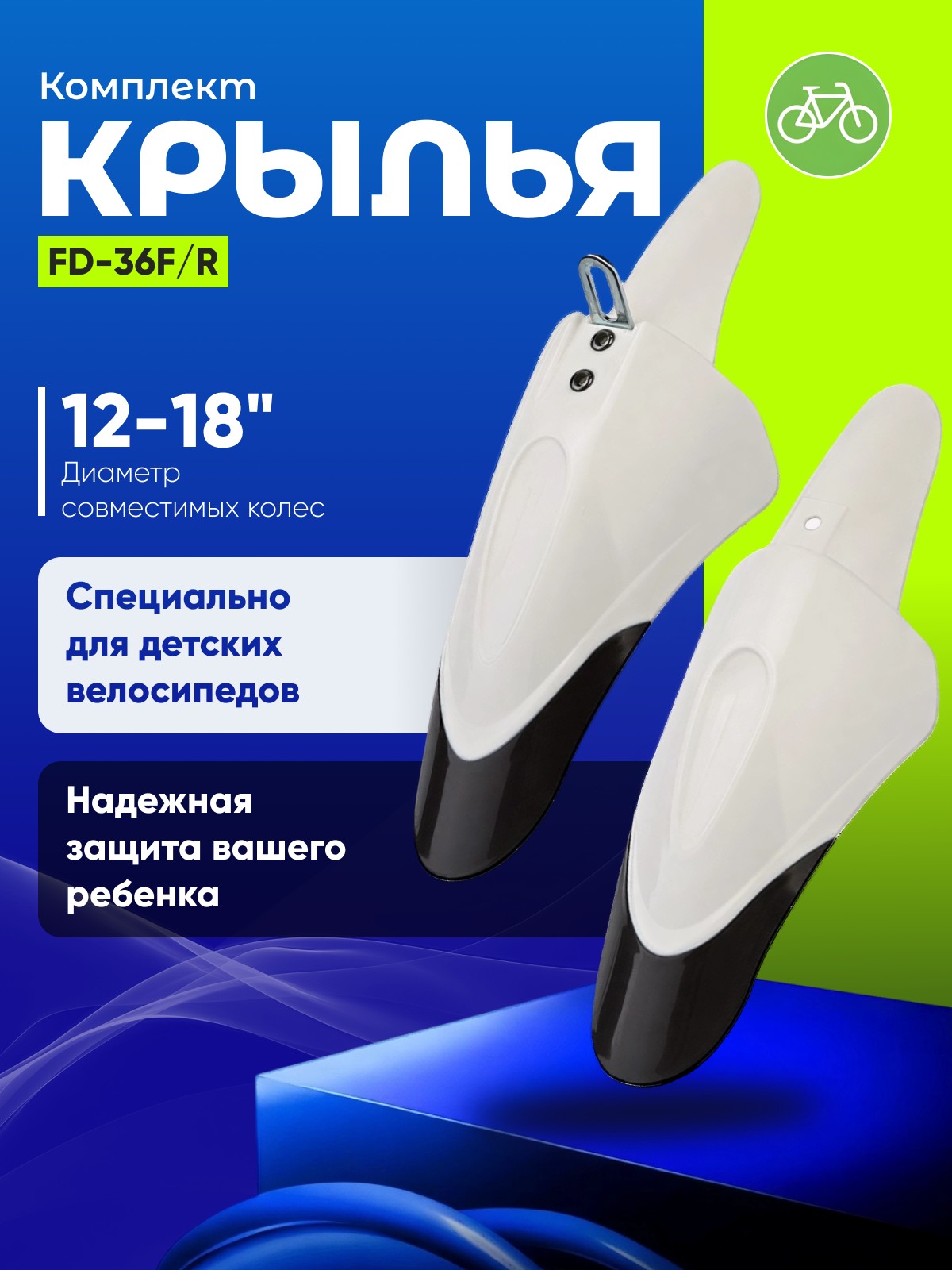 FD-36F/R - качественный комплект пластиковых крыльев. Предназначен специально для детских велосипедов, у которых диаметр колес составляет 12-18ʺ. тот набор - надежная защита одежды вашего ребенка от попадания грязи и водяных брызг. Набор устойчив к перепадам температур.