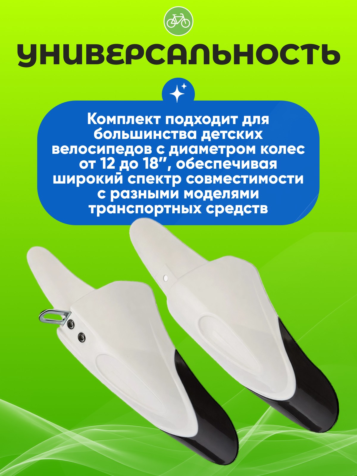 Комплект подходит для большинства детских велосипедов с диаметром колес от 12 до 18ʺ, обеспечивая широкий спектр совместимости с разными моделями транспортных средств.