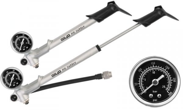 Насос высокого давления Giyo GS-02. Разработан специально для накачки воздушных вилок амортизации и задних амортизаторов с демпфером пневматическим. Корпус насоса изготовлен из крепкого алюминиевого сплава, в руке удобно помещается ручка. Предельное давление - 300psi (21 атм). Насос оснащен высокоточным манометром и кнопкой микро-регулировки (2-3 psi). Серебристо-черный цвет.