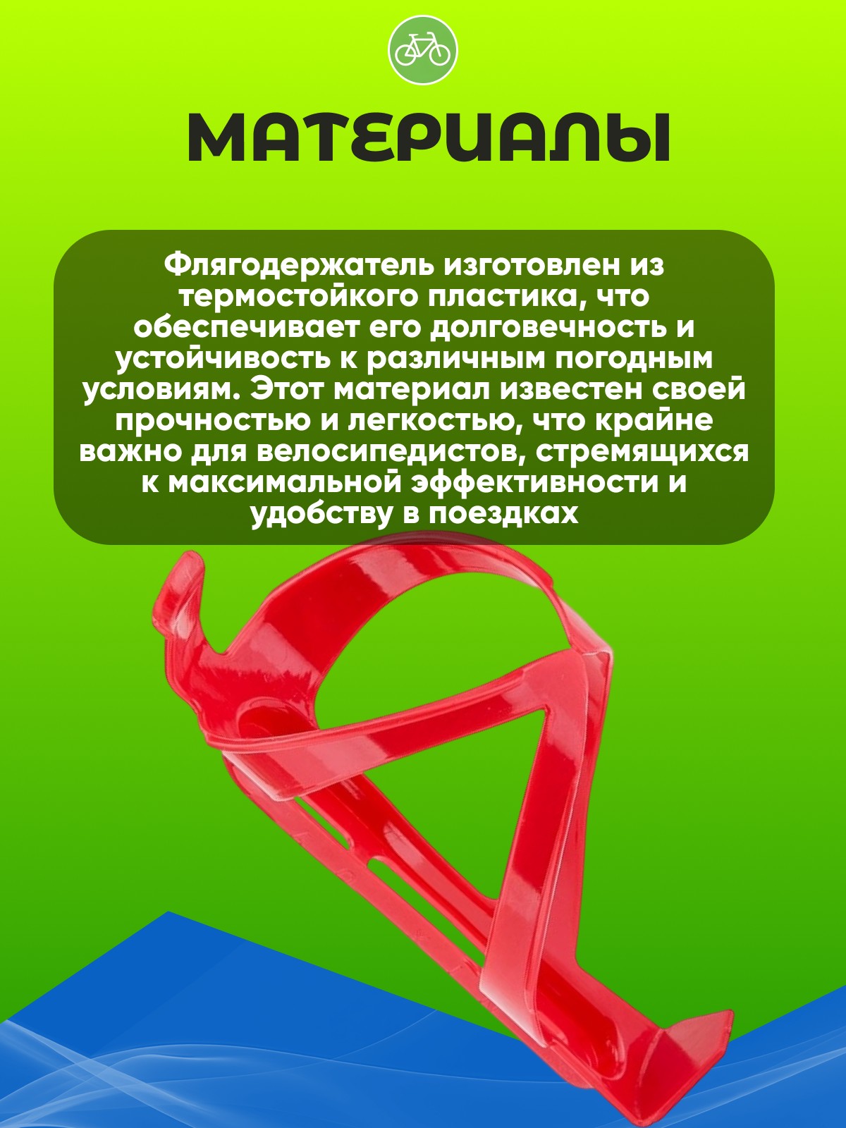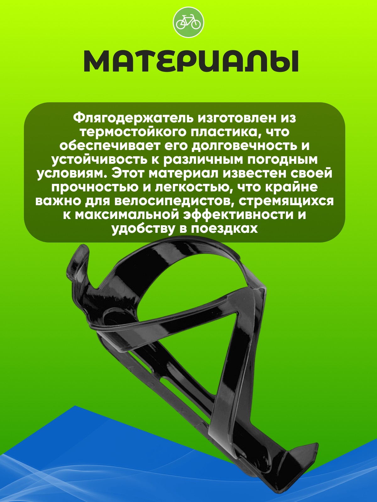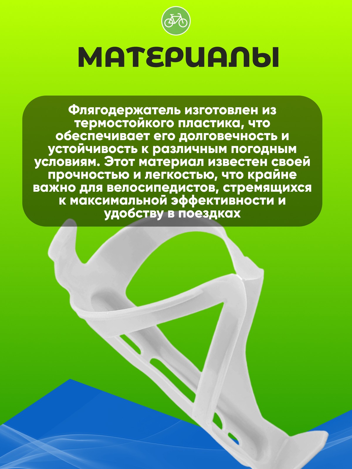 Флягодержатель изготовлен из термостойкого пластика, что обеспечивает его долговечность и устойчивость к различным погодным условиям. Этот материал известен своей прочностью и легкостью, что крайне важно для велосипедистов, стремящихся к максимальной эффективности и удобству в поездках.
