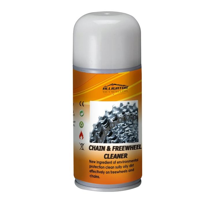 Если вы катаетесь достаточно часто и не выбираете погодных условий, то рано или поздно цепь и кассета становятся очень грязными. Чтобы быстро отчистить эти элементы трансмиссии компания Alligator разработала специальное средство Degreaser HK-CFC15. Состав спрея проникает меж звеньев цепи, устраняя загрязнение. Нанесите средство на цепь или кассету и подождите 1-2 минуты, после этого прокрутите цепь и удалите излишки тряпкой. Для более сильных загрязнений используйте щетку. Объем флакона - 150 мл.