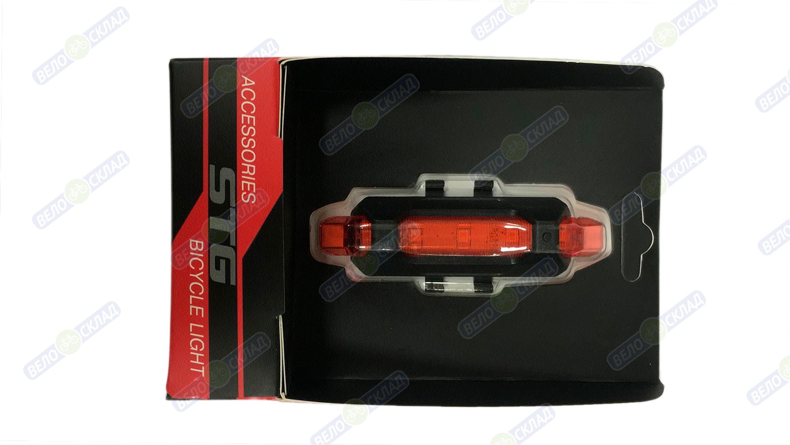 Задний фонарик STG TL-5411.5 крепится вдоль подседельного штыря с помощью силиконового хомута. Внутри расположены 5 ярко-красных светодиодов и батарея емкостью 250mAH. Фонарик заряжается от USB. Цвет - черный/красный.