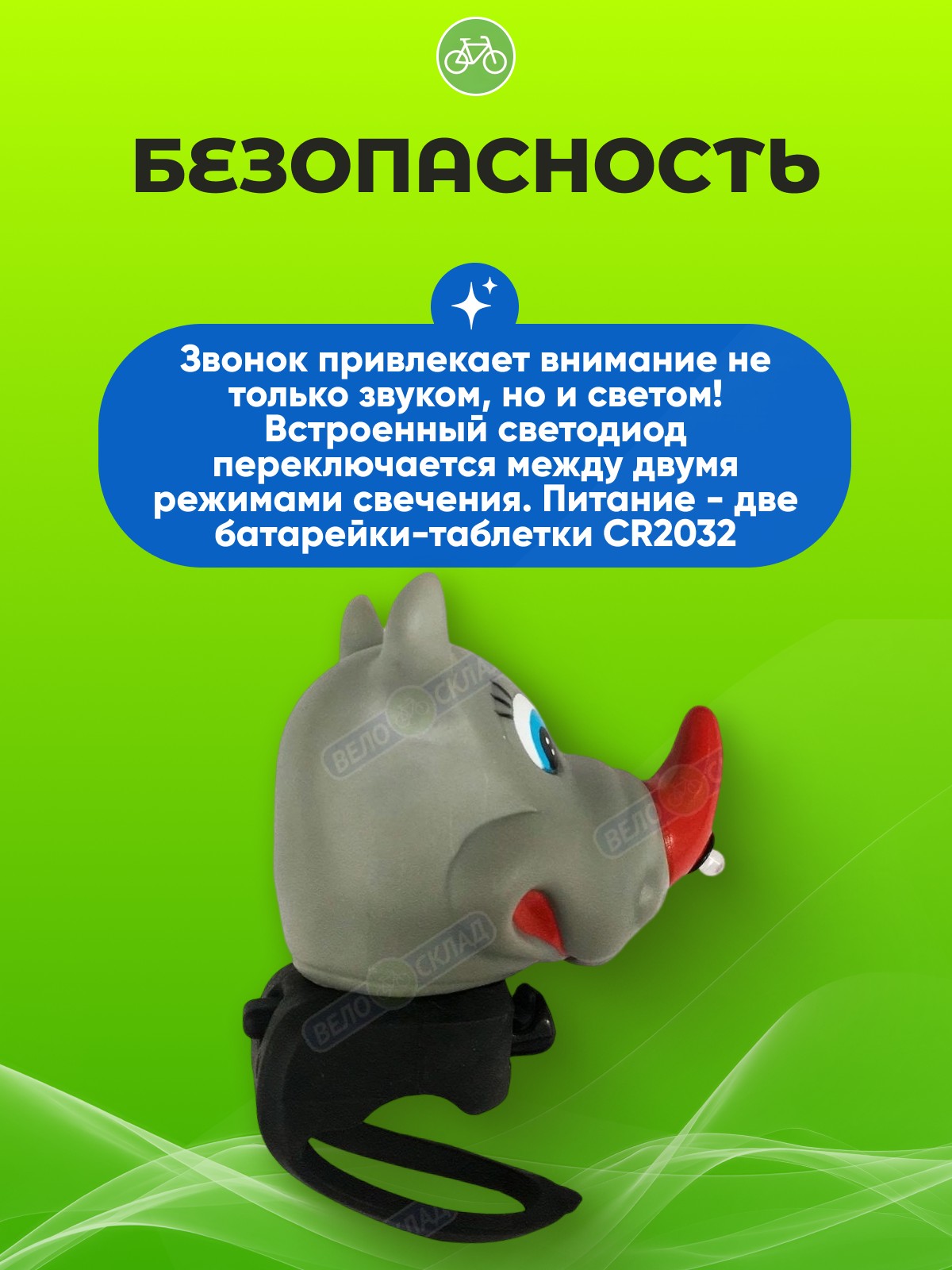 Модель CHL1001RH представляет собой детский звонок с пневматической системой подачи сигнала. Он имеет форму забавной фигурки носорога, что делает его отличным выбором для маленьких велосипедистов.