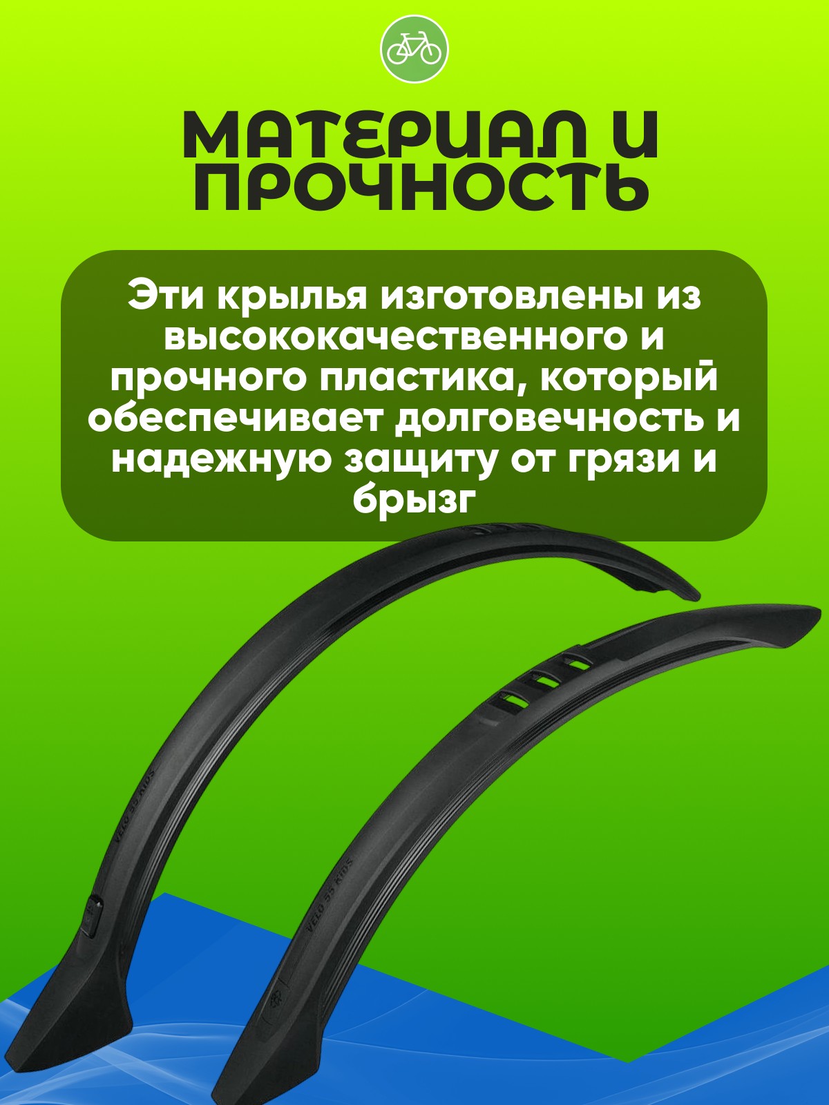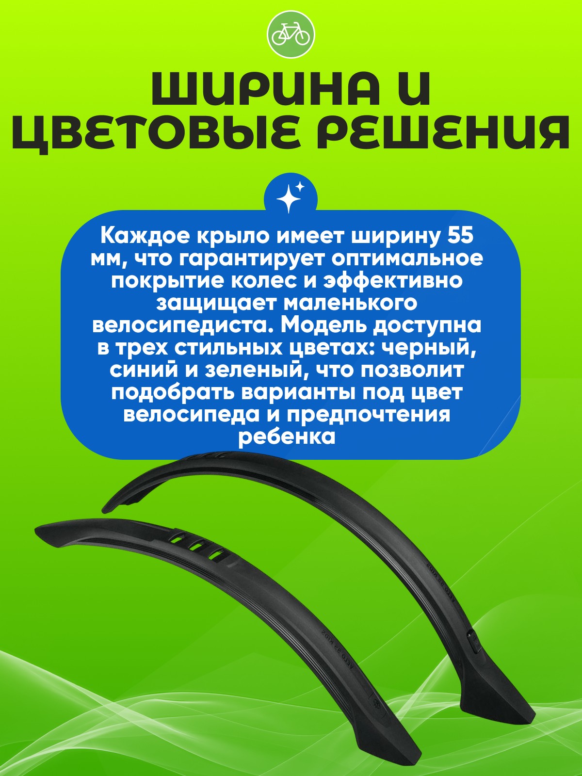 Каждое крыло имеет ширину 55 мм, что гарантирует оптимальное покрытие колес и эффективно защищает маленького велосипедиста от грязи и воды на дороге. Модель доступна в трех стильных цветах: черный, синий и зеленый, что позволит подобрать варианты под цвет велосипеда и предпочтения ребенка.
