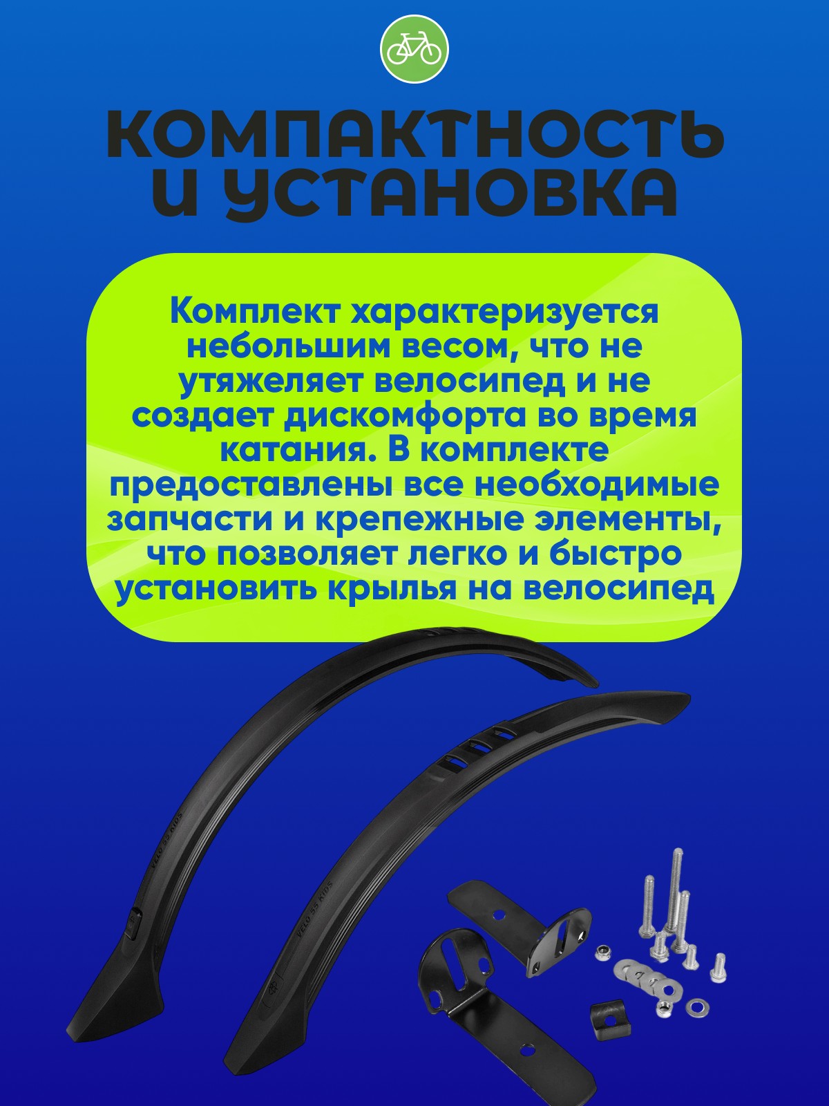 Комплект характеризуется небольшим весом, что не утяжеляет велосипед и не создает дискомфорта во время катания. В комплекте предоставлены все необходимые запчасти и крепежные элементы, что позволяет легко и быстро установить крылья на велосипед.