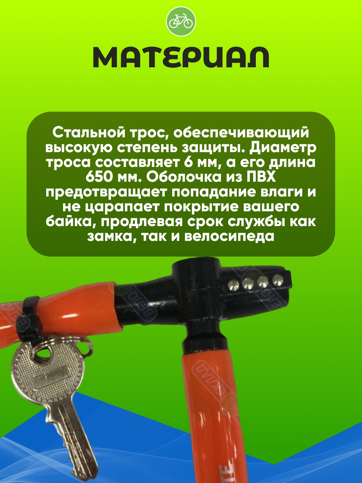 Материал: стальной трос, обеспечивающий высокую степень защиты. Диаметр троса составляет 6 мм, а его длина 650 мм.