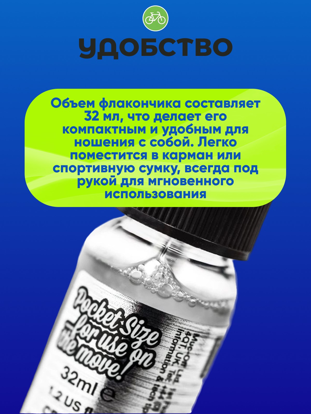 Объем флакончика составляет 32 мл, что делает его компактным и удобным для ношения с собой. Легко поместится в карман или спортивную сумку, всегда под рукой для мгновенного использования.