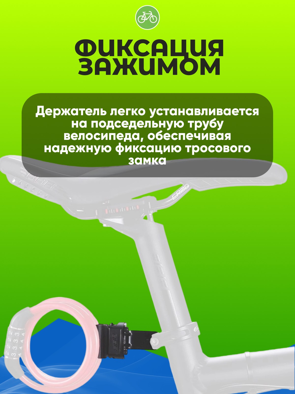 Фиксация зажимом: Держатель легко устанавливается на подседельную трубу велосипеда, обеспечивая надежную фиксацию тросового замка.