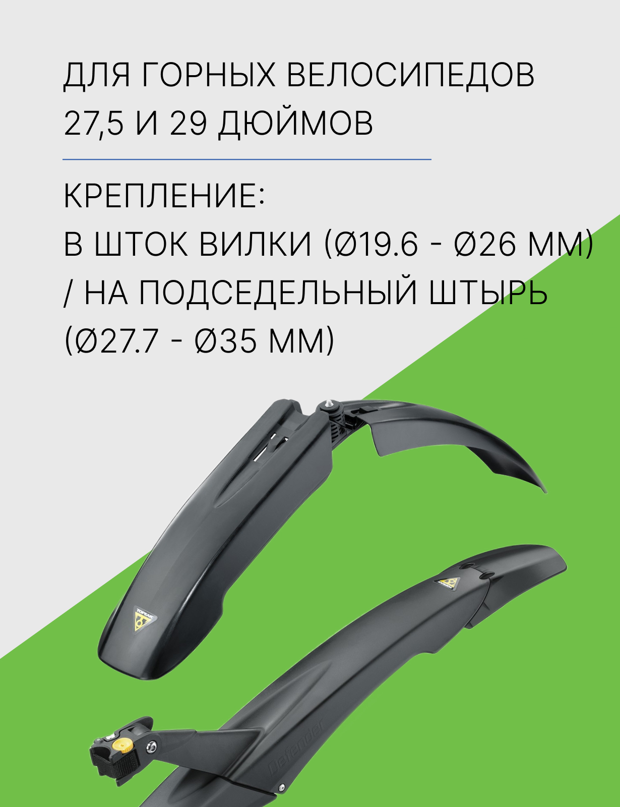 Быстросъемные крепления: Оснащены регулируемыми быстросъемными креплениями, что обеспечивает простую и быструю установку, а также снятие крыльев. Эти крепления подходят для различных вилок и подседельных штырей, делая комплект универсальным.