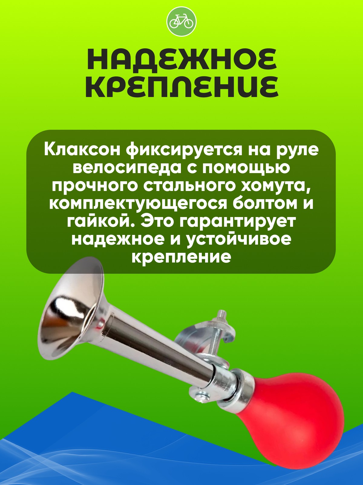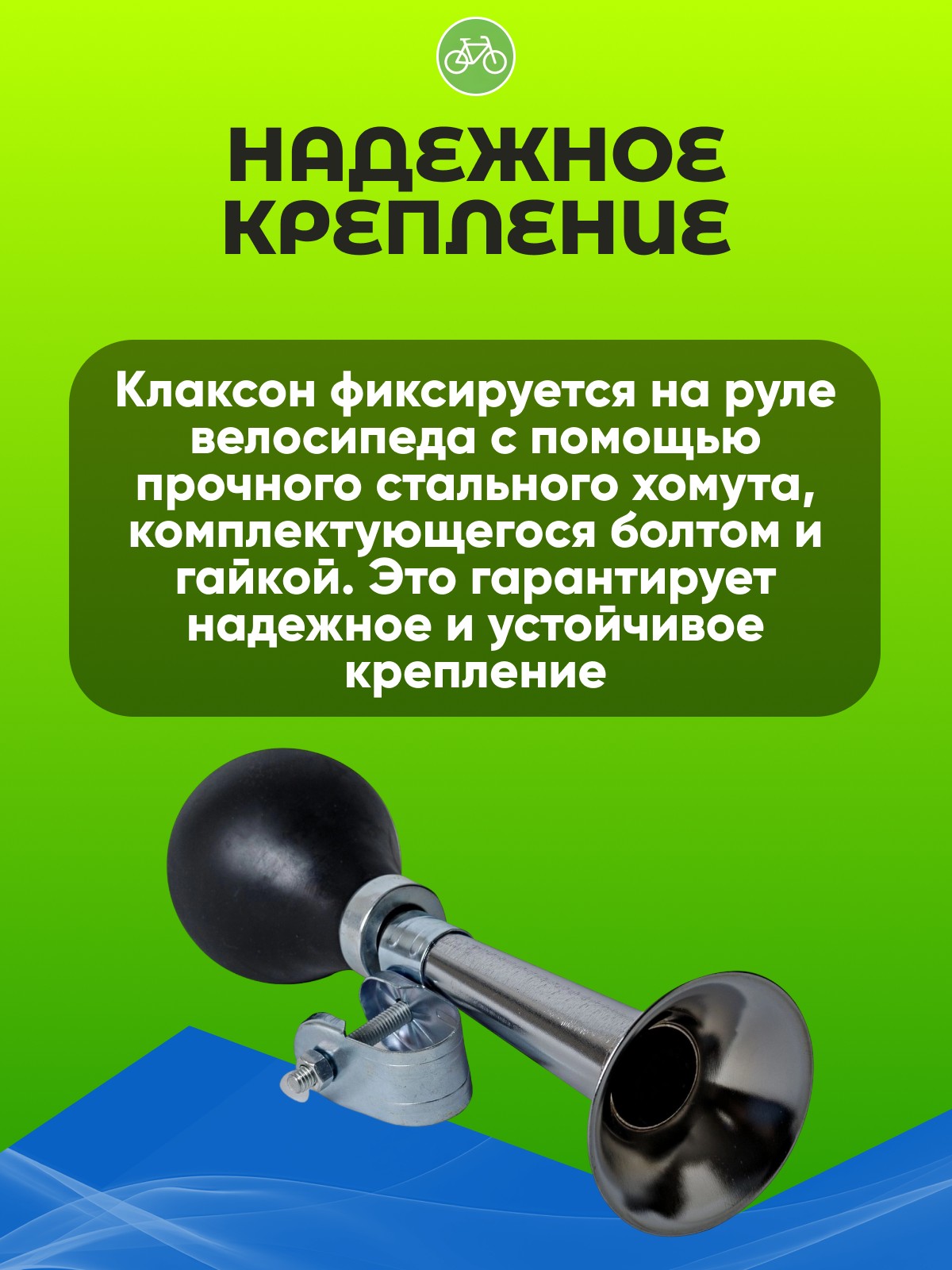 Клаксон фиксируется на руле велосипеда с помощью прочного стального хомута, комплектующегося болтом и гайкой. Это гарантирует надежное и устойчивое крепление, что особенно важно во время активных поездок.