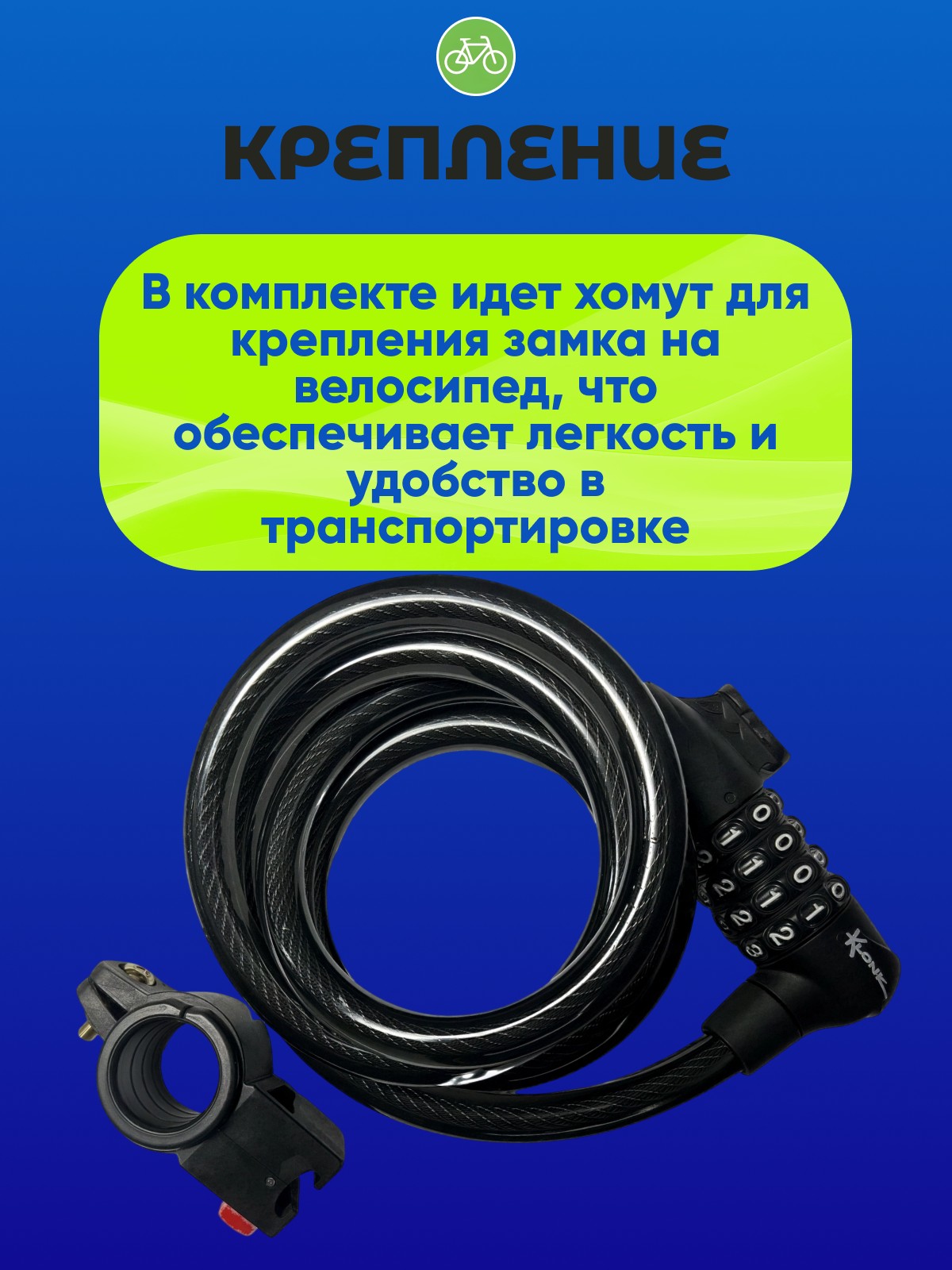 - Удобный хомут-крепление: В комплекте идет хомут для крепления замка на велосипед, что обеспечивает легкость и удобство в транспортировке.