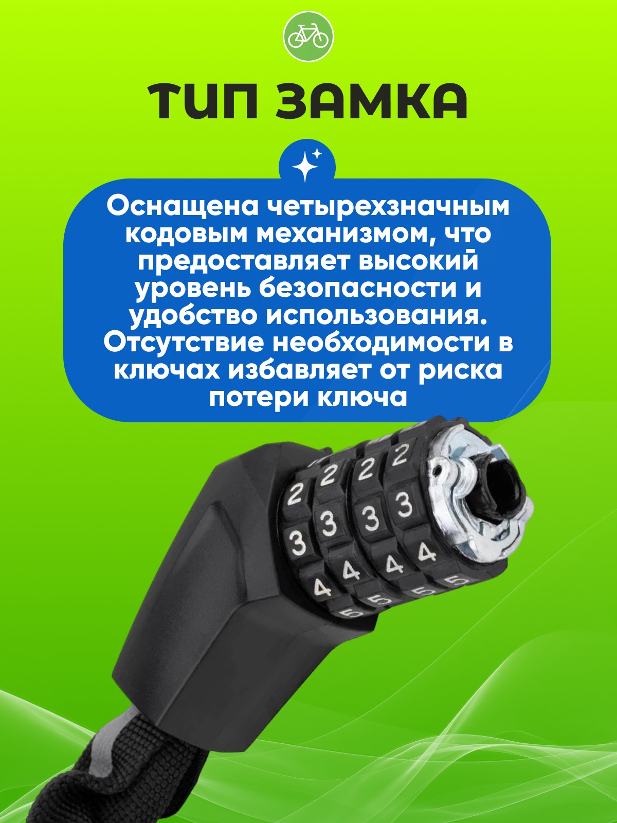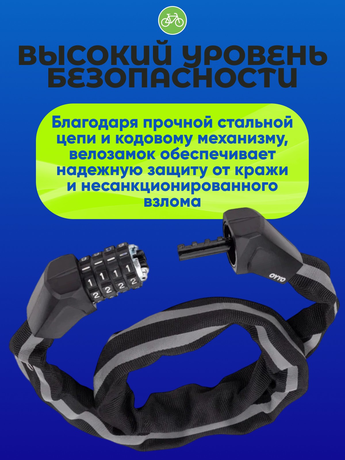 - Высокий уровень безопасности: Благодаря прочной стальной цепи и кодовому механизму, велозамок обеспечивает надежную защиту от кражи и несанкционированного взлома.