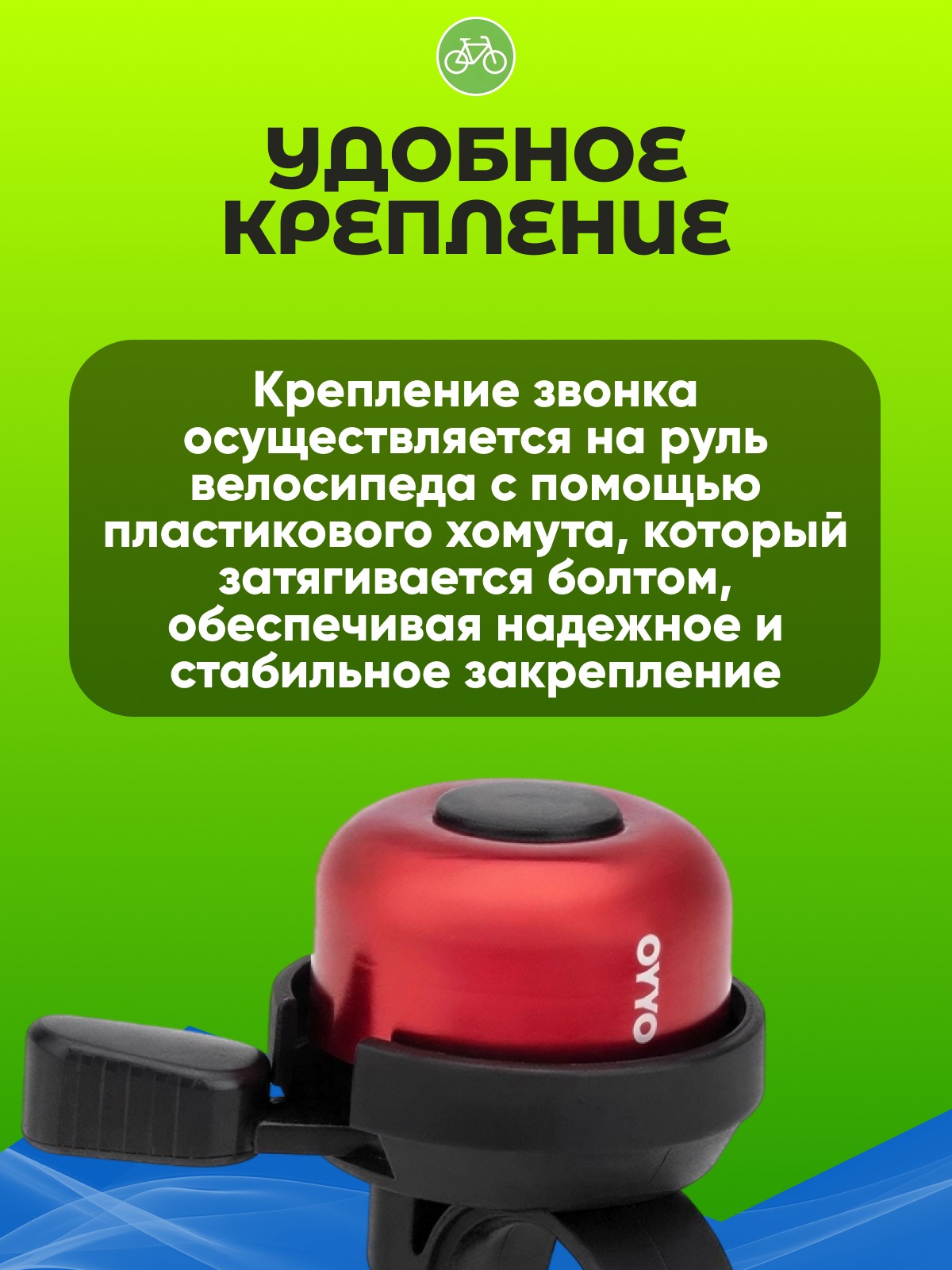 Крепление звонка осуществляется на руль велосипеда с помощью пластикового хомута, который затягивается болтом. Этот универсальный крепеж подходит для рулевых труб диаметром 22.2 мм, обеспечивая надежное и стабильное закрепление.