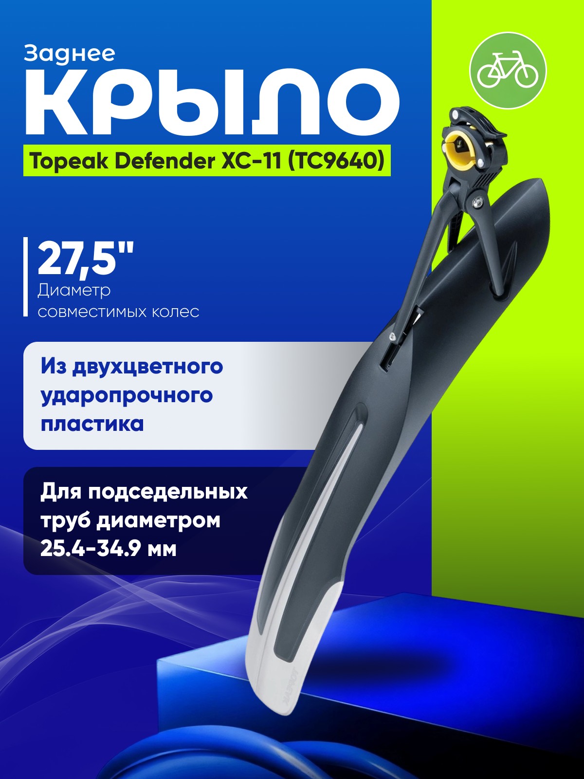 Topeak Defender XC11 27.5 (TC9640) – это заднее крыло, специально разработанное для горных байков с колесами диаметром 27,5 дюймов. Изготовленное из двухцветного ударопрочного пластика, это крыло обеспечивает надежную защиту от грязи и воды, летящих изпод колес, что делает поездку более комфортной и чистой.