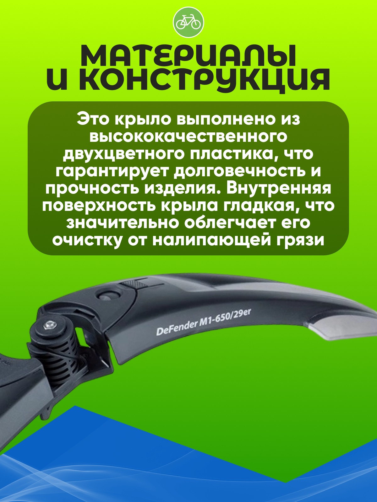 Это крыло выполнено из высококачественного двухцветного пластика, что гарантирует долговечность и прочность изделия. Внутренняя поверхность крыла гладкая, что значительно облегчает его очистку от налипающей грязи.