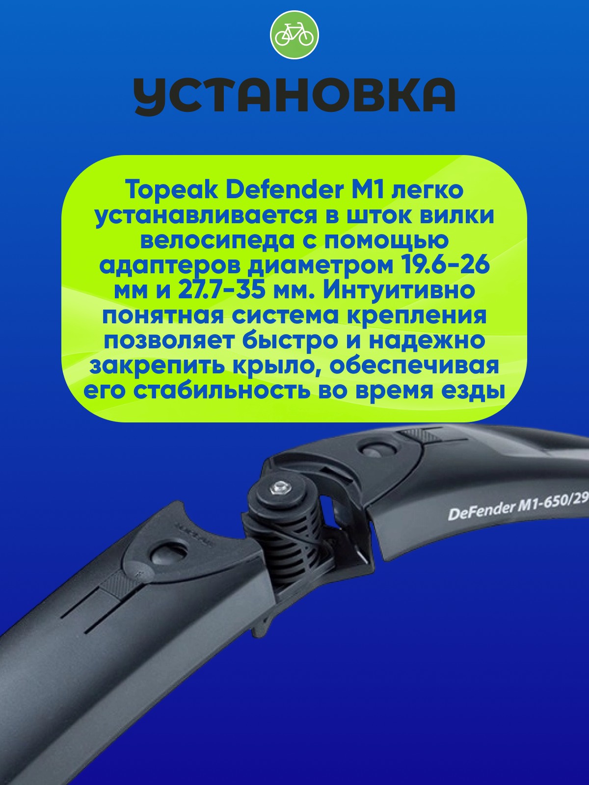 Topeak Defender M1 легко устанавливается в шток вилки велосипеда с помощью адаптеров диаметром Ø19.6-26 мм и Ø27.7-35 мм. Интуитивно понятная система крепления позволяет быстро и надежно закрепить крыло, обеспечивая его стабильность во время езды.