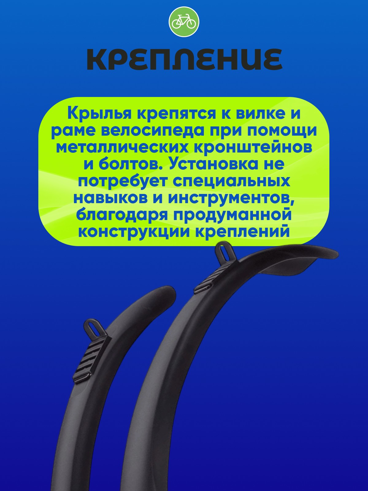 Крылья крепятся к вилке и раме велосипеда при помощи металлических кронштейнов и болтов. Установка не потребует специальных навыков и инструментов, благодаря продуманной конструкции креплений.