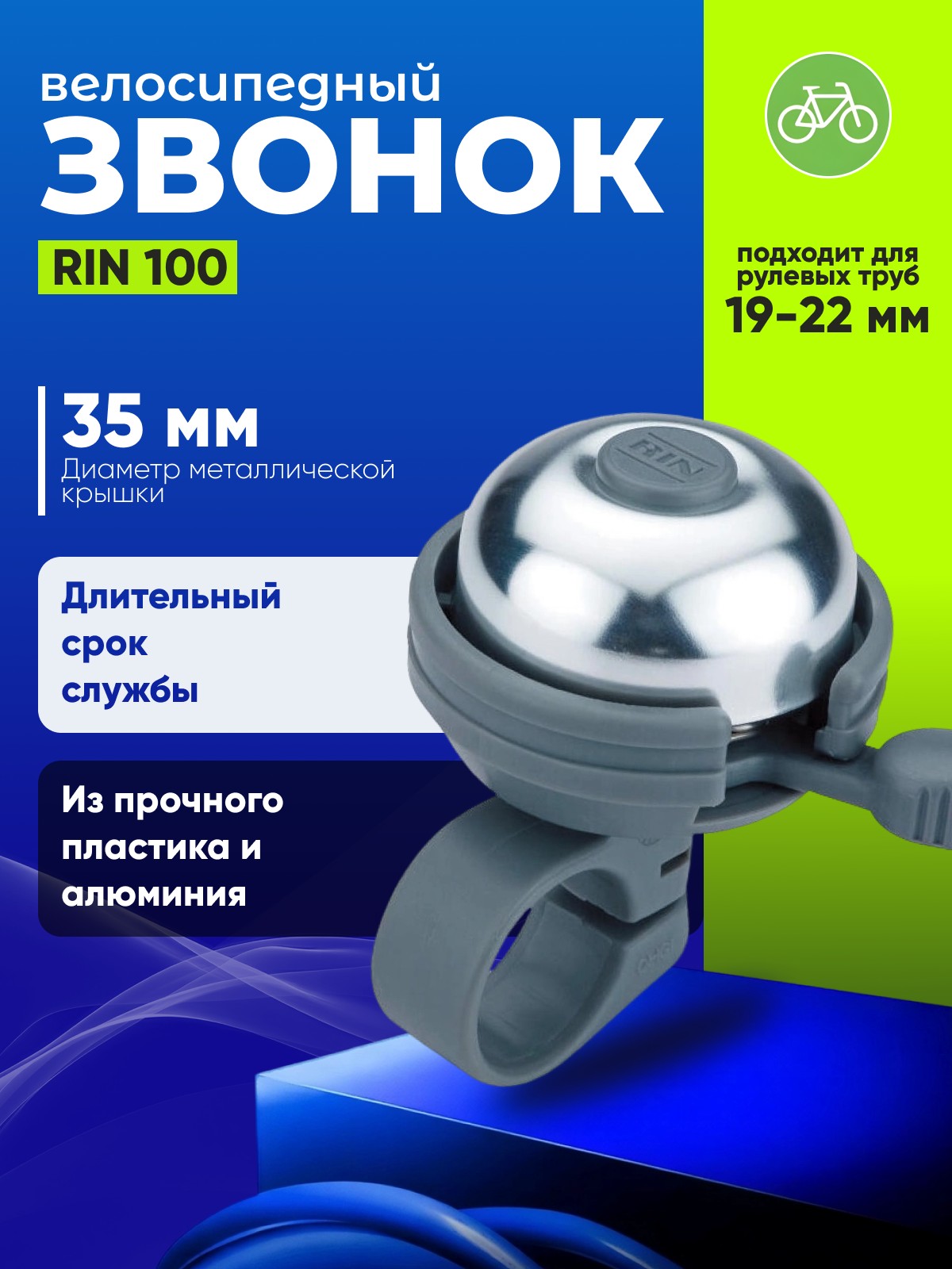 RIN 100 - стандартный и самый простой велосипедный звонок. Дает громкий сигнал. Легко крепится на руль за счет хомута. Достаточно простой в использовании, он создает громкий звон, предупреждая пешеходов о Вашем приближении, что в свою очередь гарантирует Вам безопасность при городском движении. Модель звонка универсальная, он не будет выбиваться из общего стиля велосипеда.