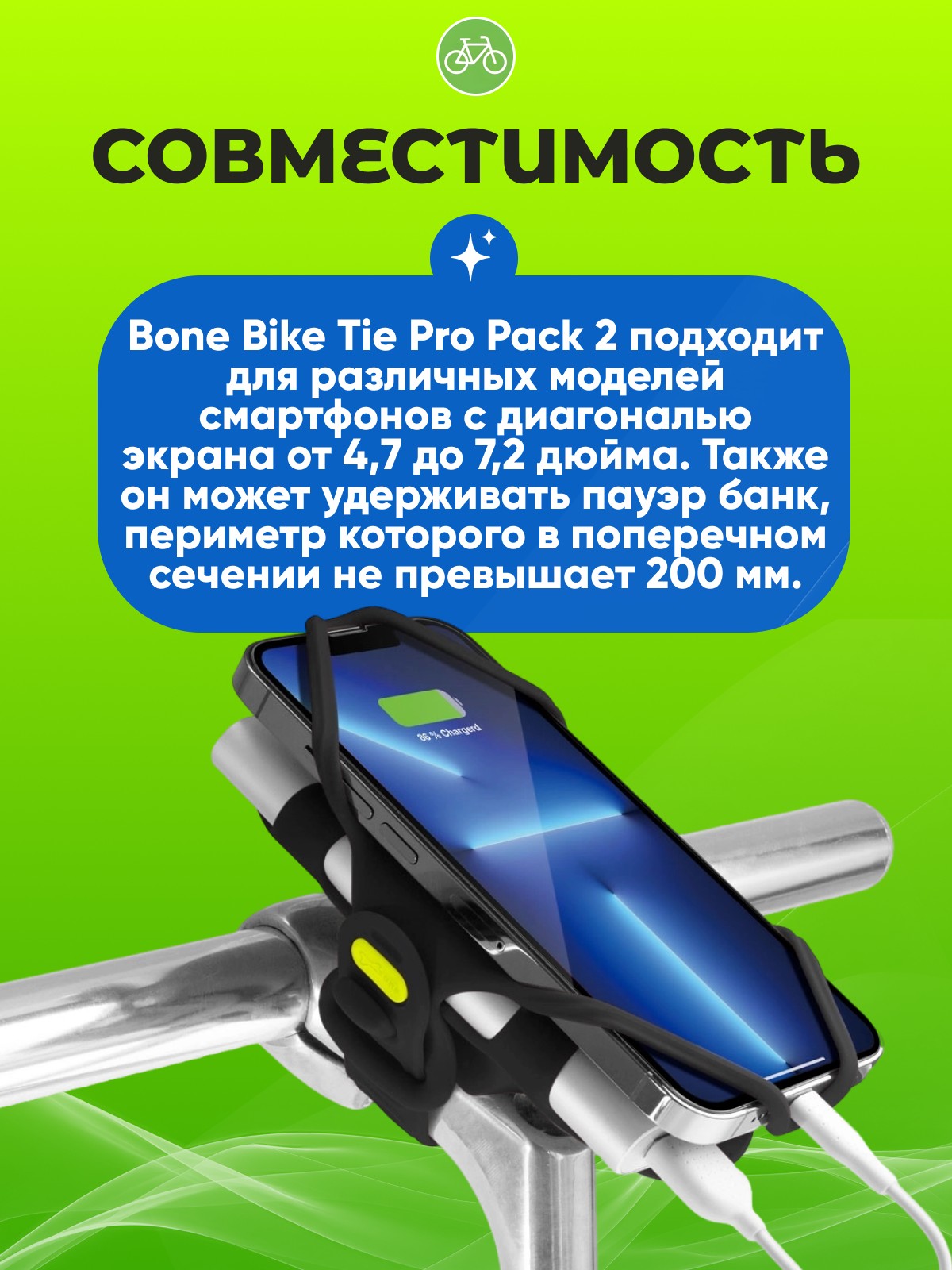 Bone Bike Tie Pro Pack 2 подходит для различных моделей смартфонов с диагональю экрана от 4,7 до 7,2 дюйма. Также он может удерживать пауэр банк, периметр которого в поперечном сечении не превышает 200 мм. Это делает держатель идеальным выбором для большинства современных гаджетов.
