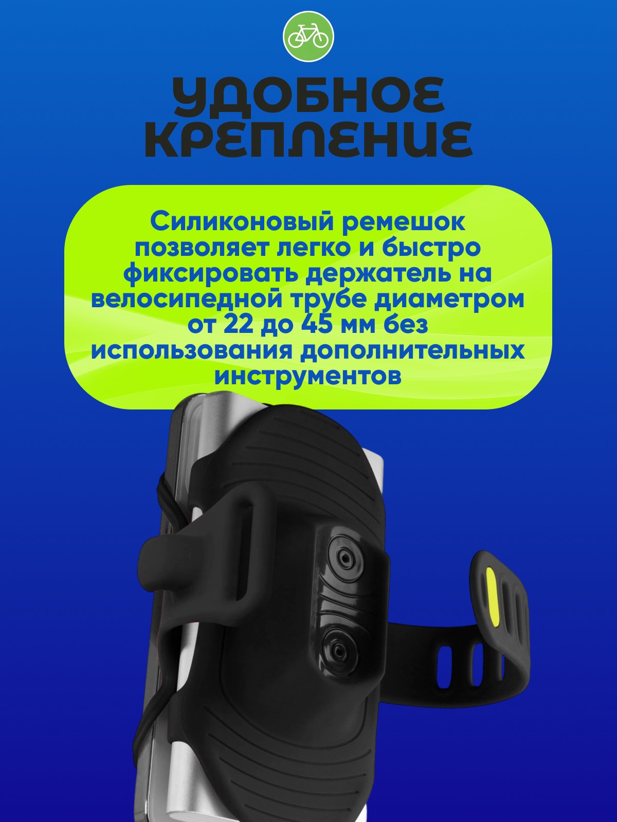 - Удобное крепление: Силиконовый ремешок позволяет легко и быстро фиксировать держатель на велосипедной трубе диаметром от 22 до 45 мм без использования дополнительных инструментов.