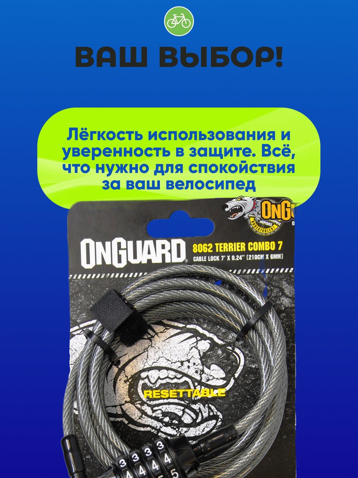 OnGuard Terrier Combo 7 (8062) - это компактный и удобный тросовый замок, который поможет вам безопасно припарковать любимый велосипед на городской стоянке. Замок оснащен четырехзначным кодовым механизмом. Система защелкивания с технологией Steel Ball Combo защищена от взлома и выдергивания. Трос в мягкой виниловой оплетке не царапает покрытие рамы и другие детали байка. Толщина троса - 6 мм. Длина троса - 2100 мм. Компактные размеры позволяют спрятать замок в рюкзак или небольшую поясную сумку. Цвет: черный.