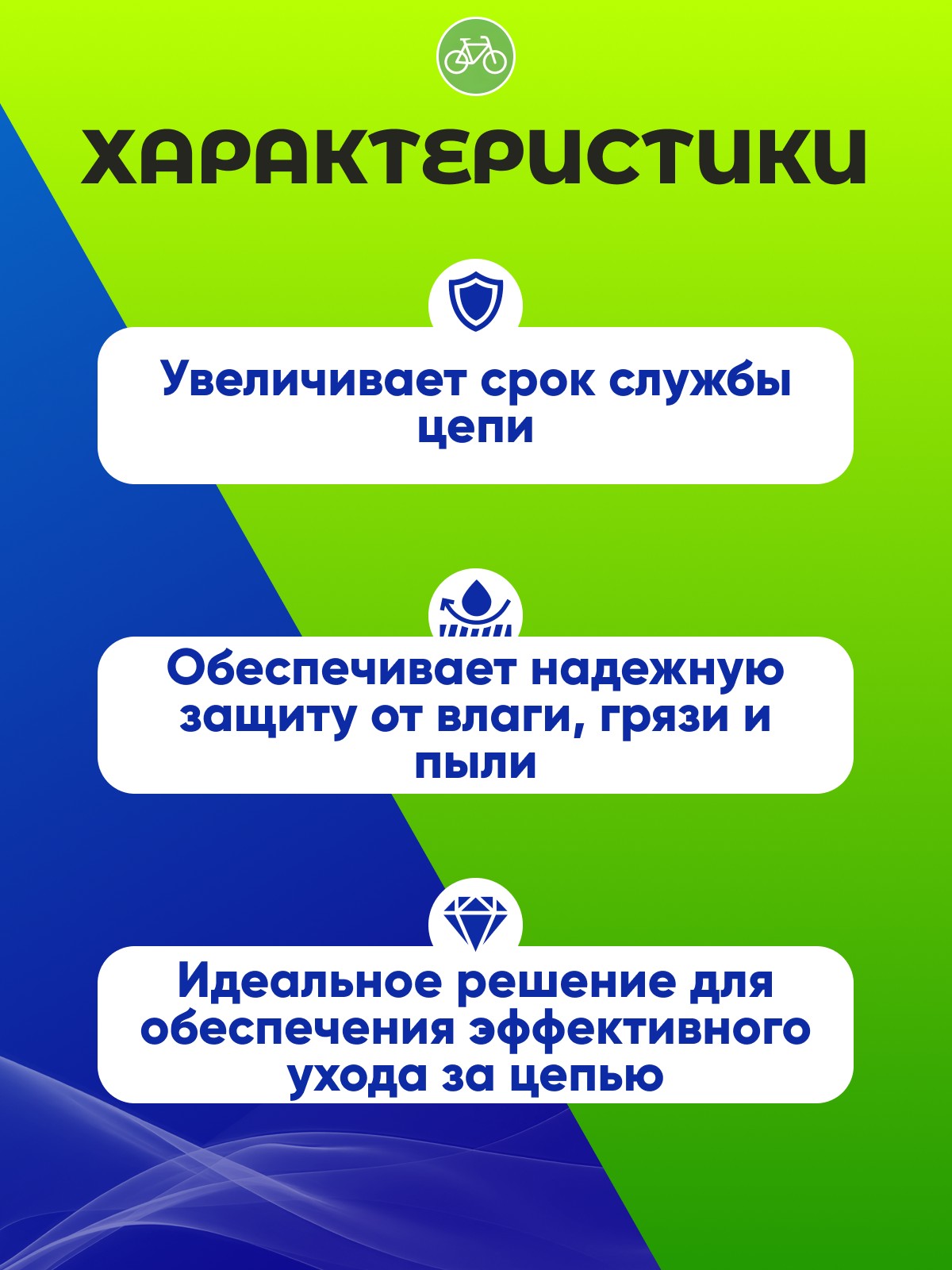 Продукт легко наносится, быстро проникает в мелкие зазоры цепи, обеспечивая равномерное распределение смазки по всем ее звеньям. Смазка обеспечивает плавное и бесшумное движение цепи, что существенно улучшает качество езды.
