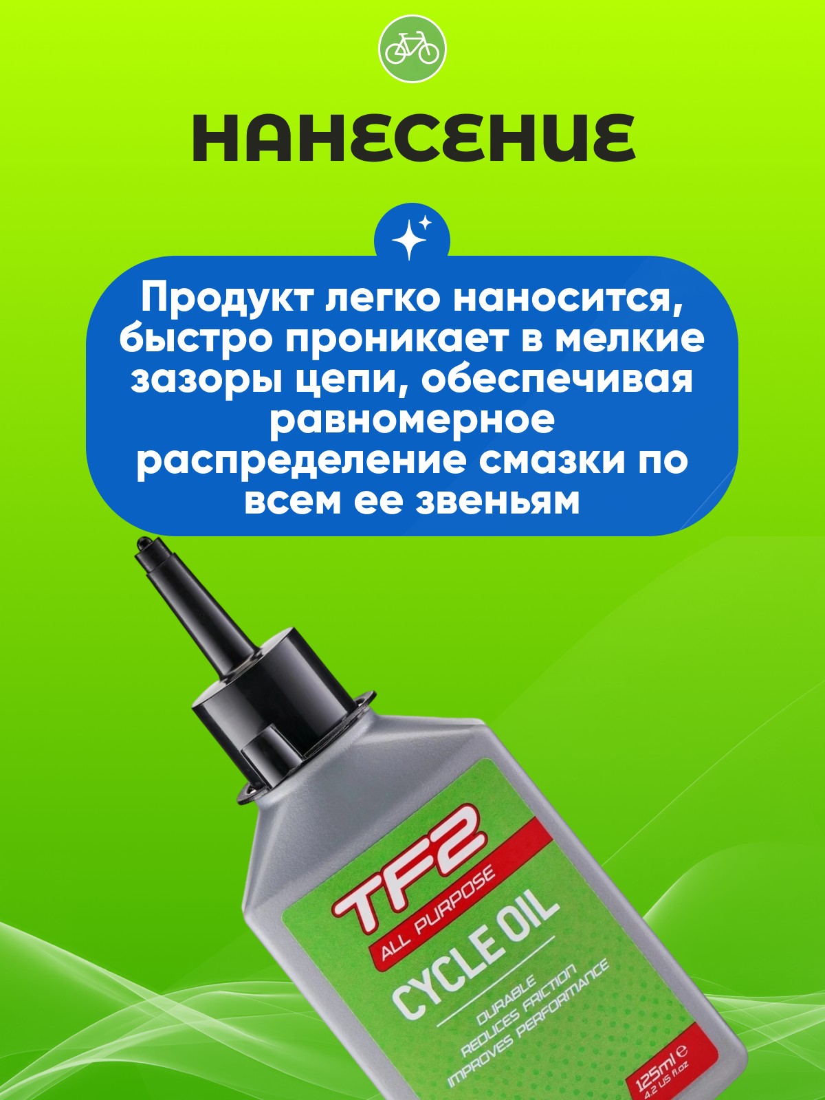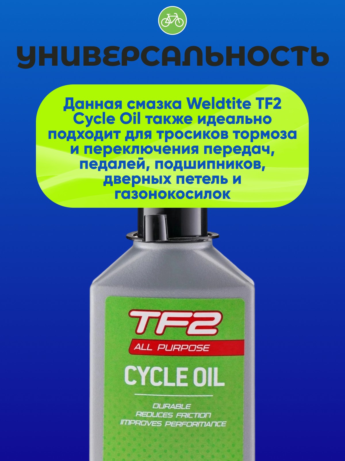 Данная смазка Weldtite TF2 Cycle Oil также идеально подходит для тросиков тормоза и переключения передач, педалей, подшипников, дверных петель и газонокосилок. Объем флакона - 125 мл.