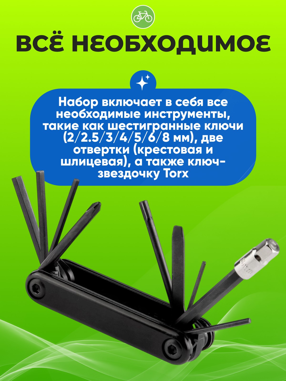 Набор включает в себя все необходимые инструменты, такие как шестигранные ключи (2/2.5/3/4/5/6/8 мм), две отвертки (крестовая и шлицевая), а также ключ-звездочку Torx. Все инструменты из прочного хром-ванадиевого сплава.