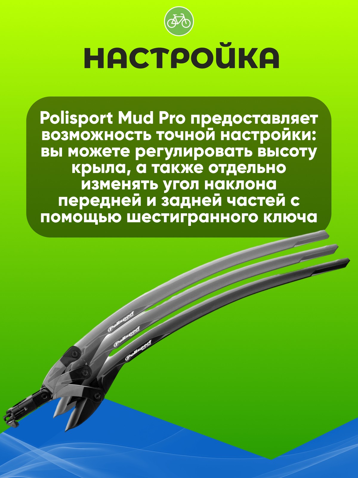 Установка крыла не требует дополнительных инструментов, что делает этот процесс простым и быстрым. Polisport Mud Pro предоставляет возможность точной настройки: вы можете регулировать высоту крыла, а также отдельно изменять угол наклона передней и задней частей с помощью шестигранного ключа.