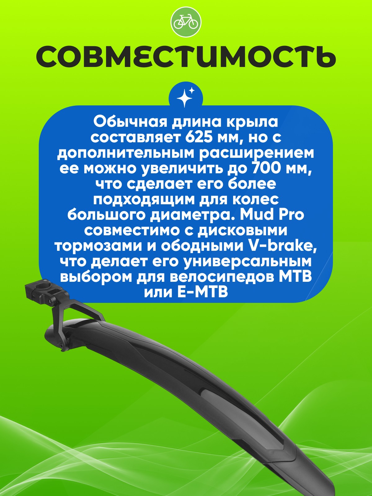 Обычная длина крыла составляет 625 мм, но с дополнительным расширением ее можно увеличить до 700 мм, что сделает его более подходящим для колес большого диаметра. Mud Pro совместимо с дисковыми тормозами и ободными V-brake, что делает его универсальным выбором для велосипедов MTB или E-MTB, как с полноподвесной системой, так и с жесткими вилками. Обеспечьте себе комфортные поездки даже в самых сложных условиях с задним крылом Polisport Mud Pro!
