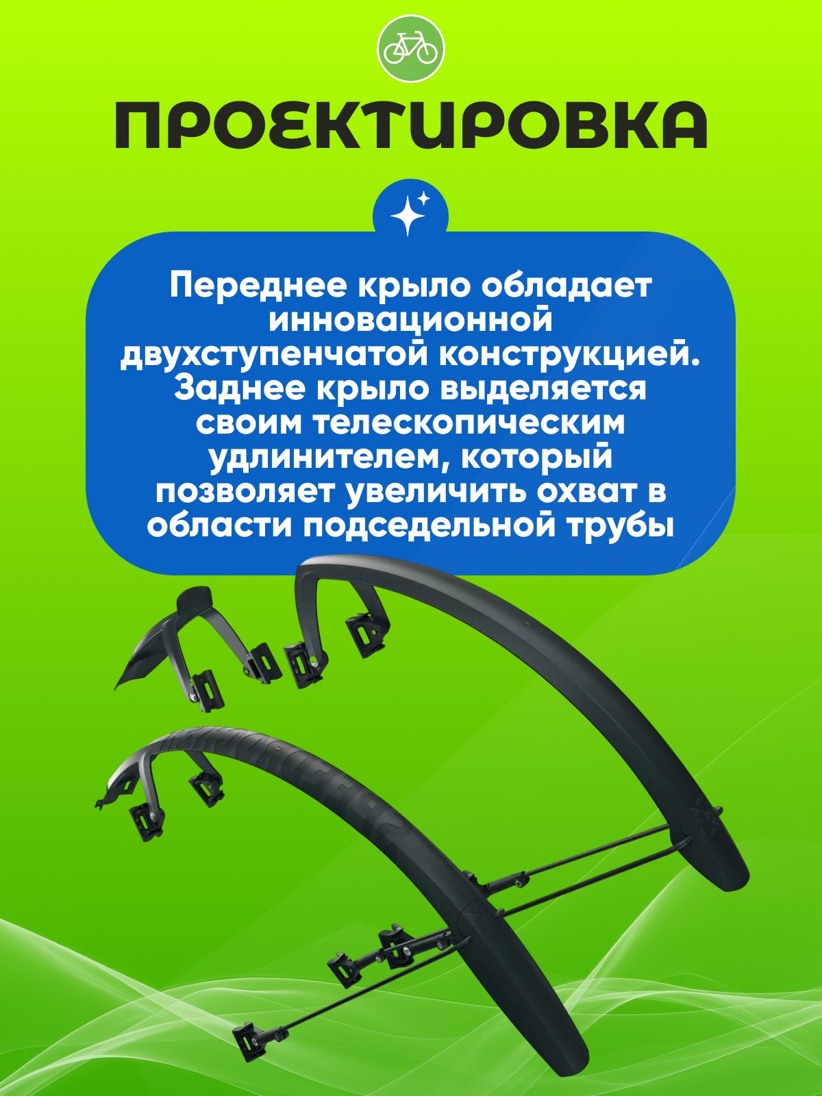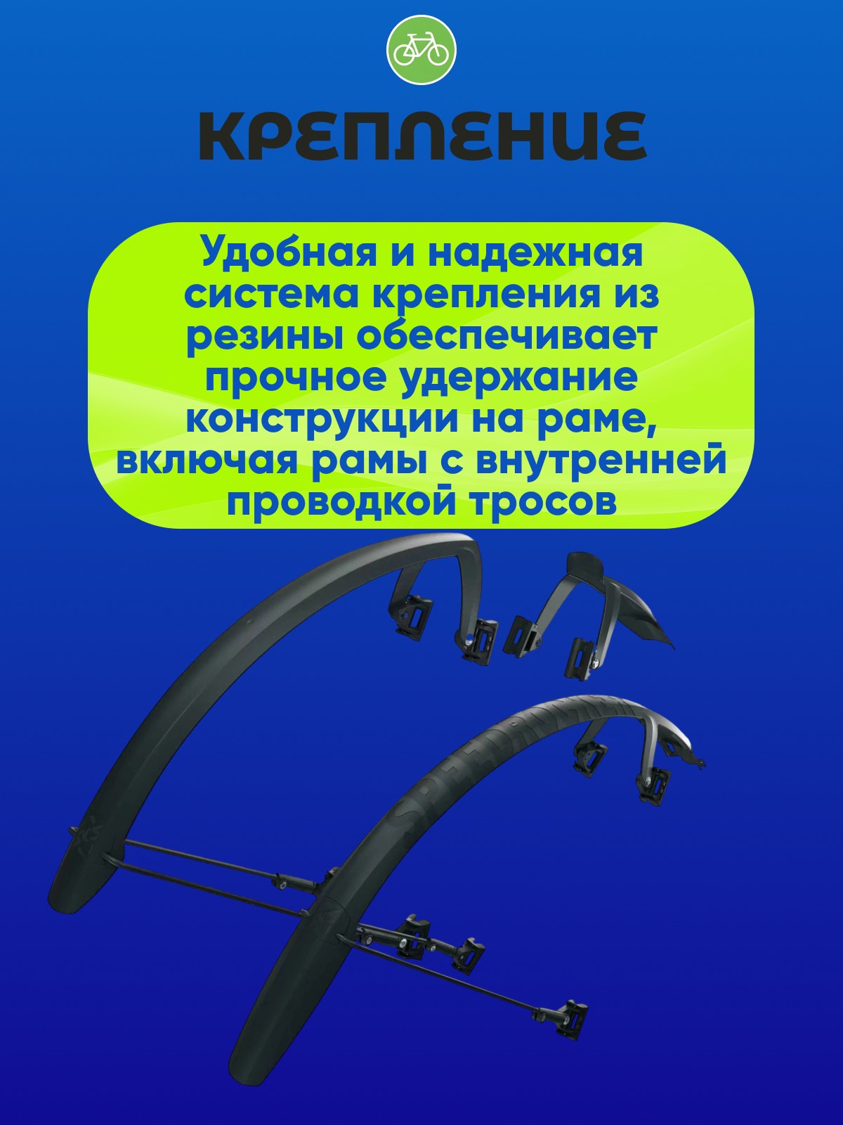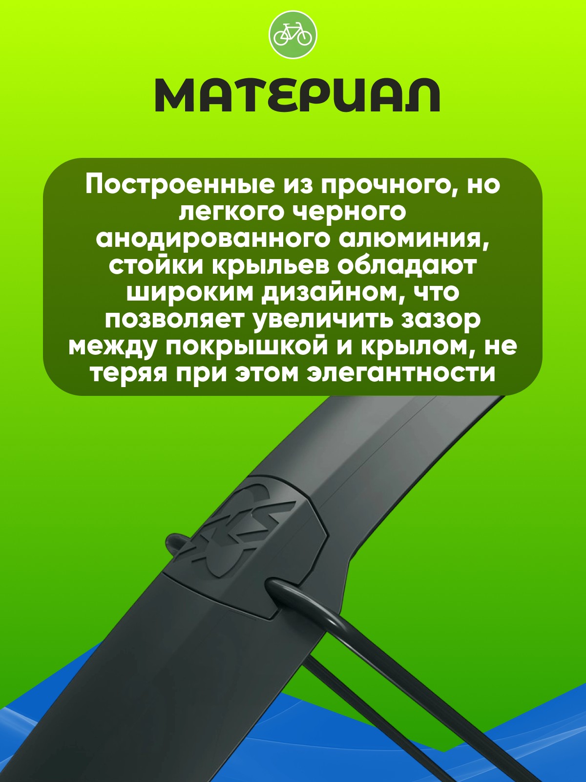 Заднее крыло выделяется своим телескопическим удлинителем, который позволяет увеличить охват в области подседельной трубы. Удобная и надежная система крепления из резины обеспечивает прочное удержание конструкции на раме, включая рамы с внутренней проводкой тросов.