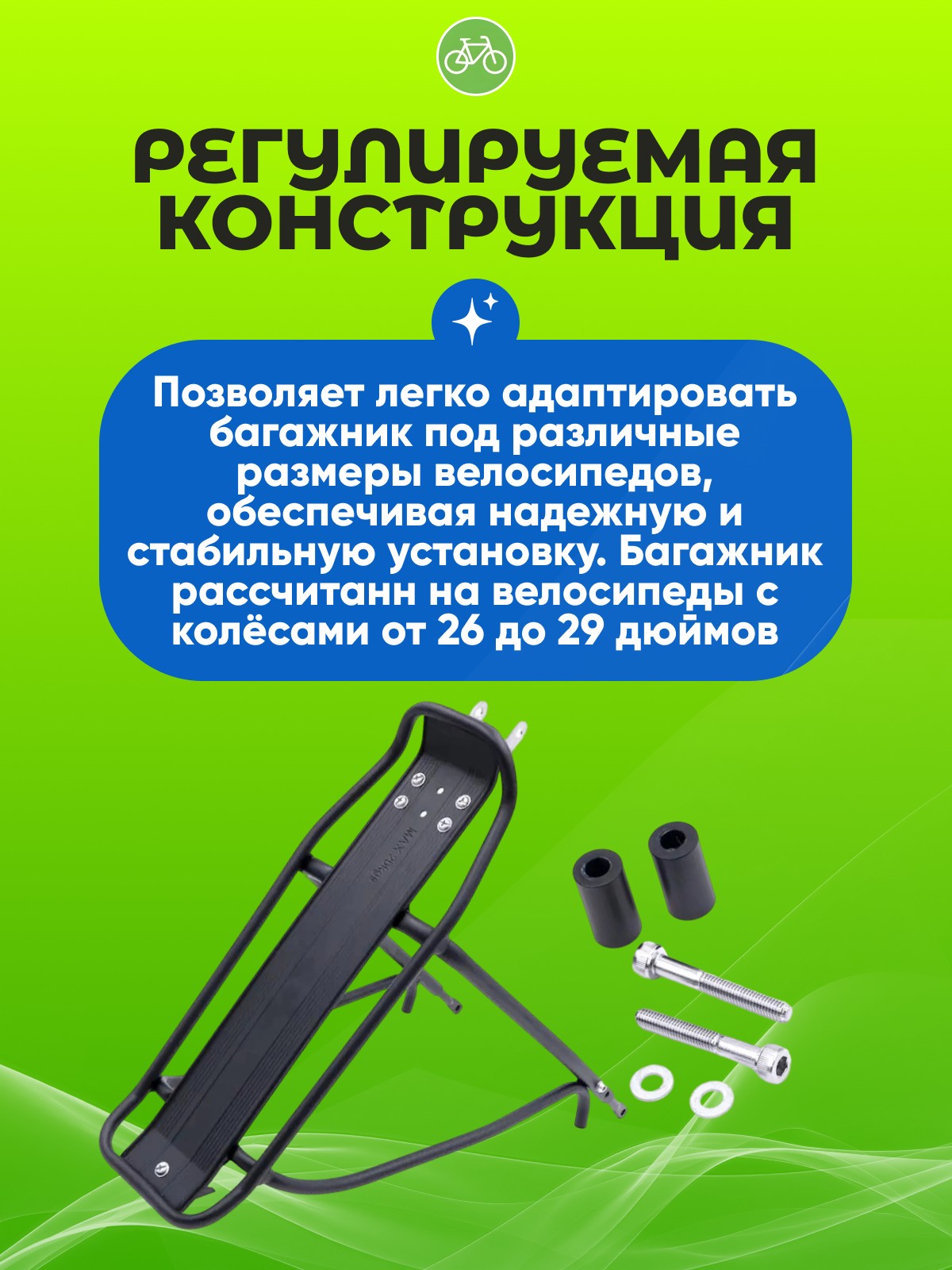 - Регулируемая конструкция: Позволяет легко адаптировать багажник под различные размеры велосипедов, обеспечивая надежную и стабильную установку.
