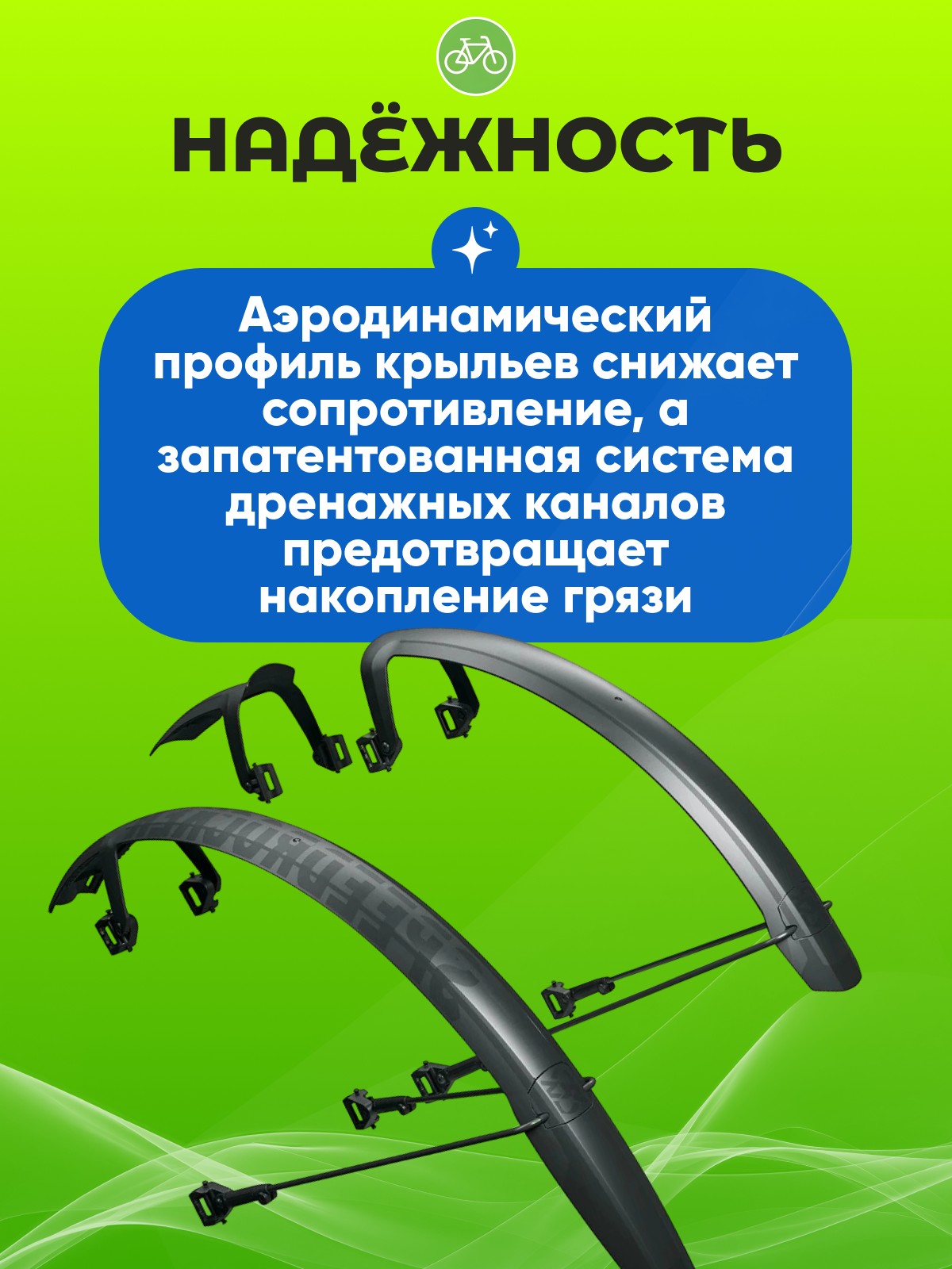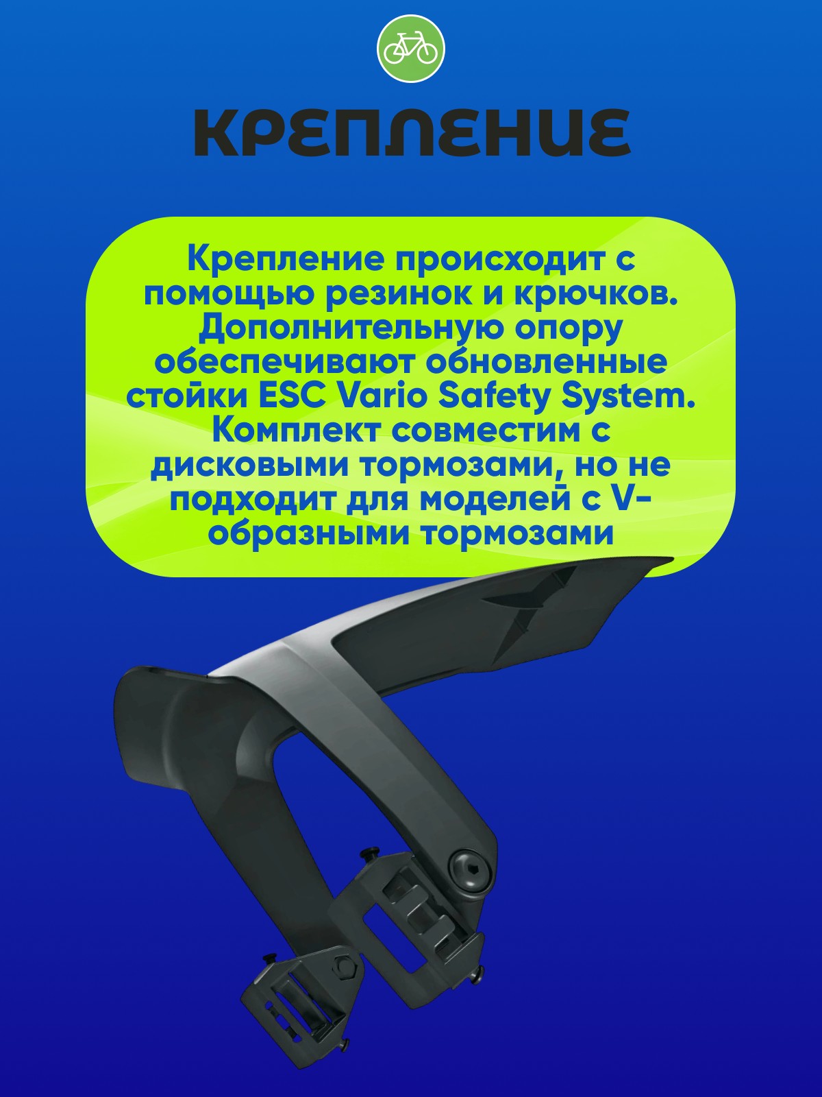 Переднее крыло оборудовано двойным спойлером, который защищает лицо велосипедиста от грязи и брызг. Телескопическую заднюю часть можно установить на велосипеды с различной геометрией рамы. Крепление происходит с помощью резинок и крючков. Дополнительную опору обеспечивают обновленные стойки ESC Vario Safety System. Комплект совместим с дисковыми тормозами, но не подходит для моделей с V-образными тормозами.