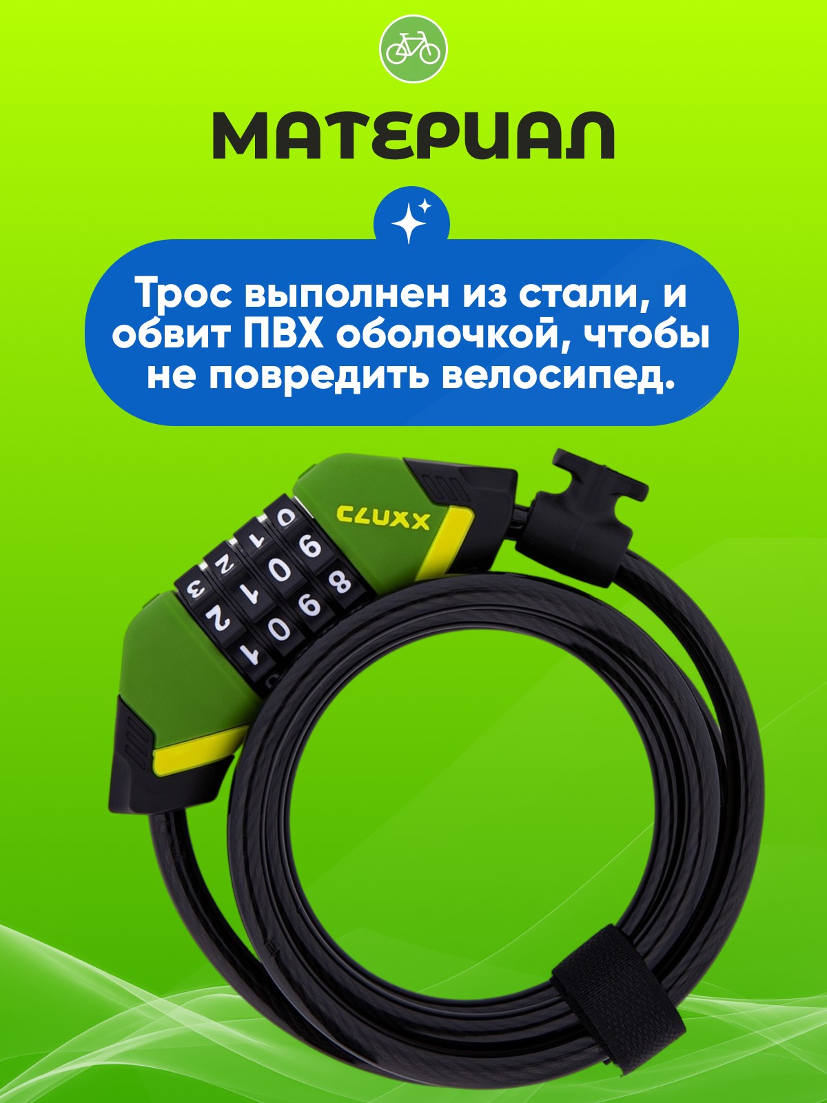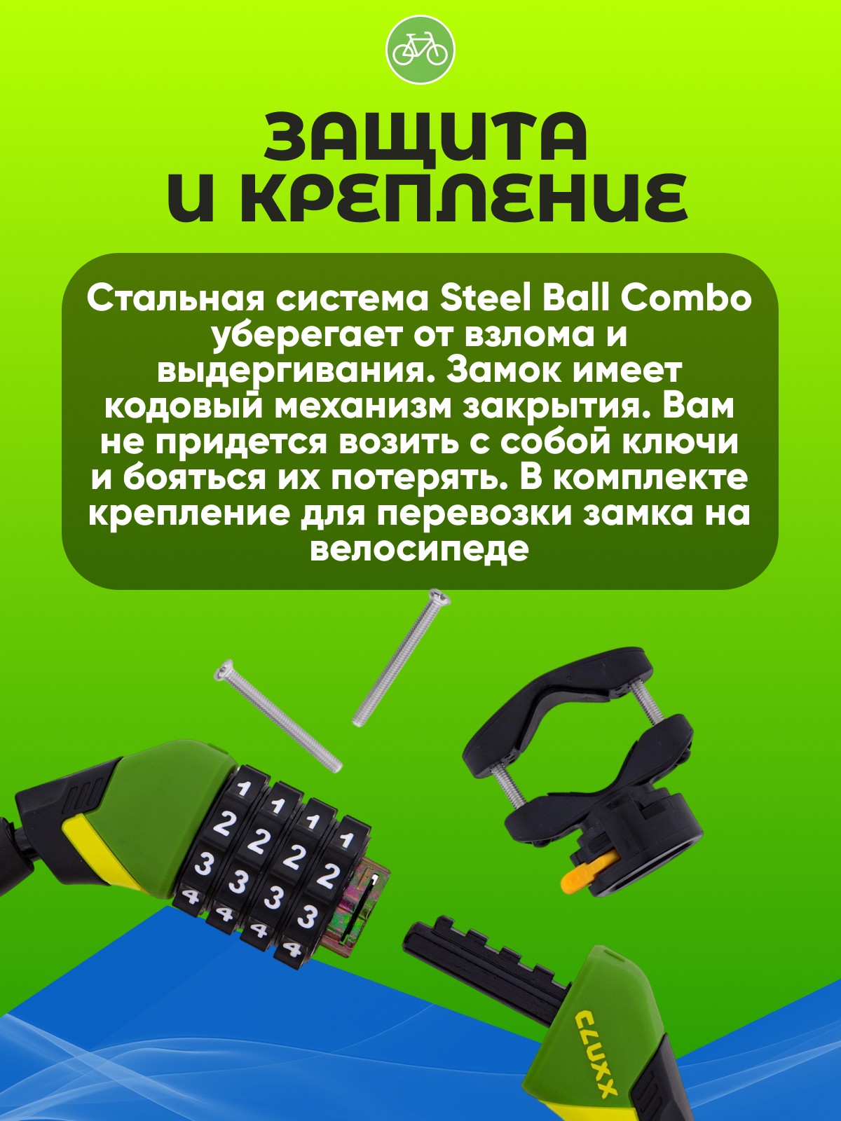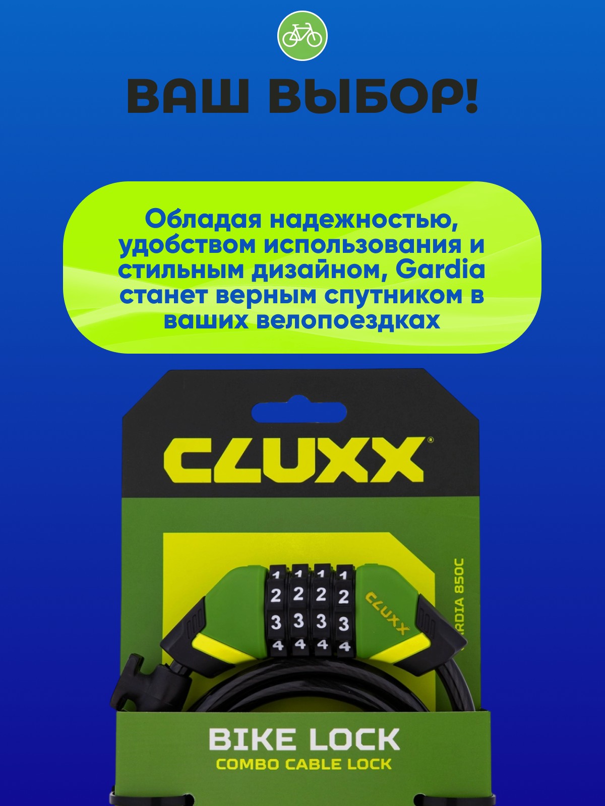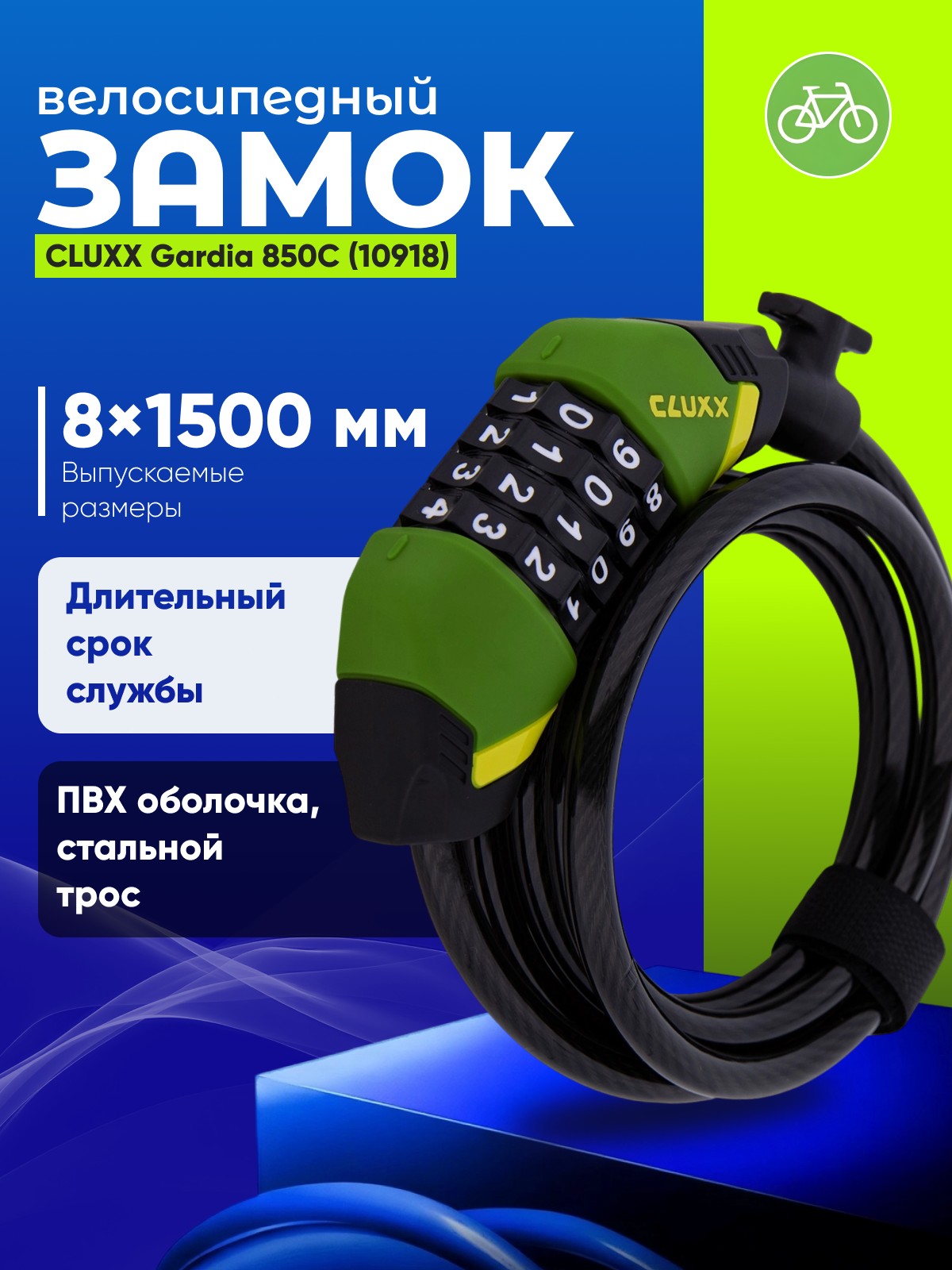 CLUXX Gardia 850C 8x1500мм - надежный кодовый велозамок. Код с 4-значной настраиваемой комбинацией. Трос выполнен из стали, и обвит ПВХ оболочкой, чтобы не повредить велосипед. Steel Ball Combo - система защелкивания со стальным шариком, устойчива к взлому и выдергиванию. Длина троса: 150см.