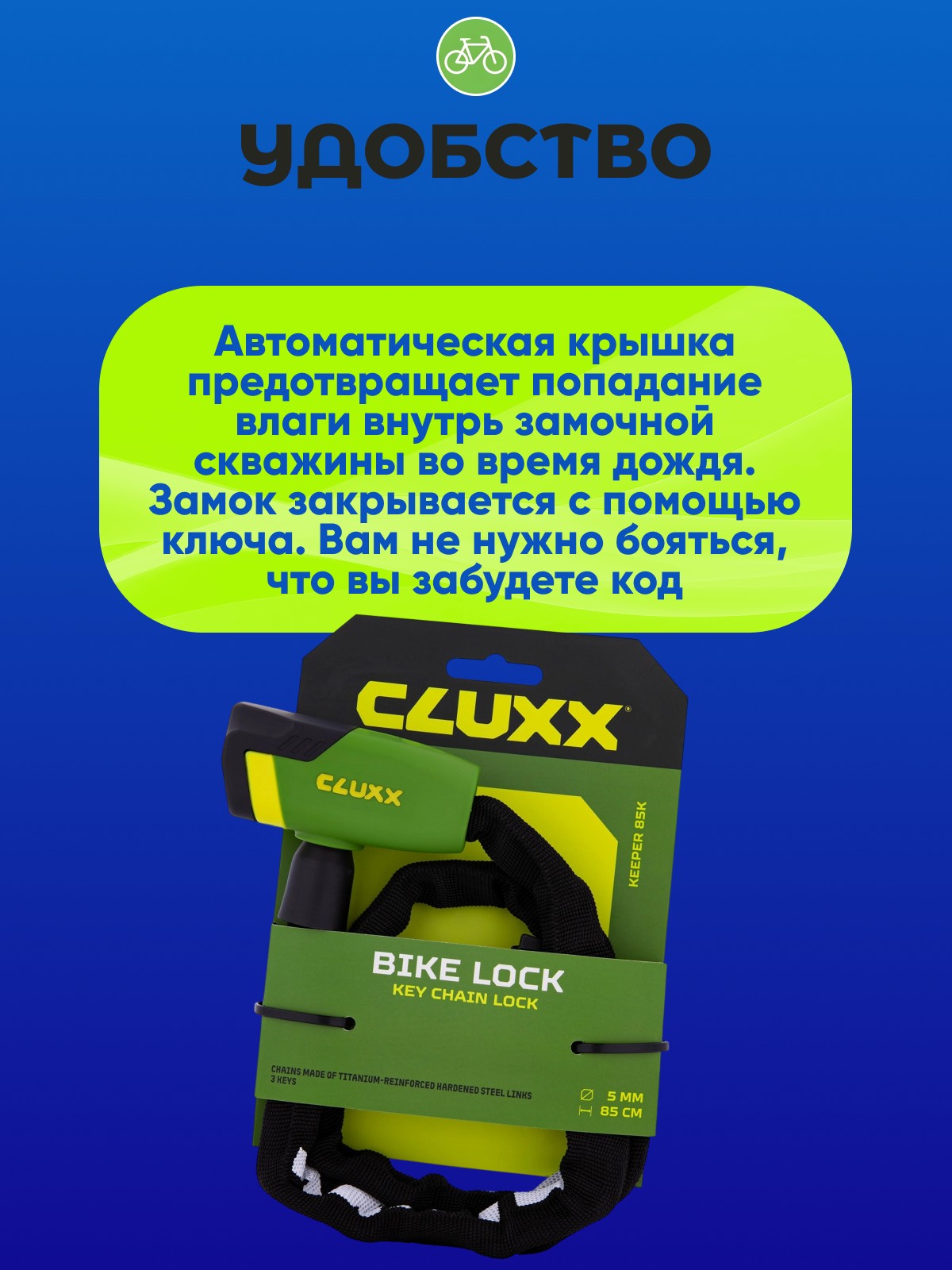 CLUXX Keeper 85K 5x850мм - надежный велозамок.Замок разблокируется с помощью ключа. Цепь выполнена из закаленной стали и титана, и обвита текстильной оболочкой, чтобы не повредить велосипед. Z-образный цилиндр с технологией BumpBlockTM защищает замок от механического разрушения и ударов. Длина троса: 85см.