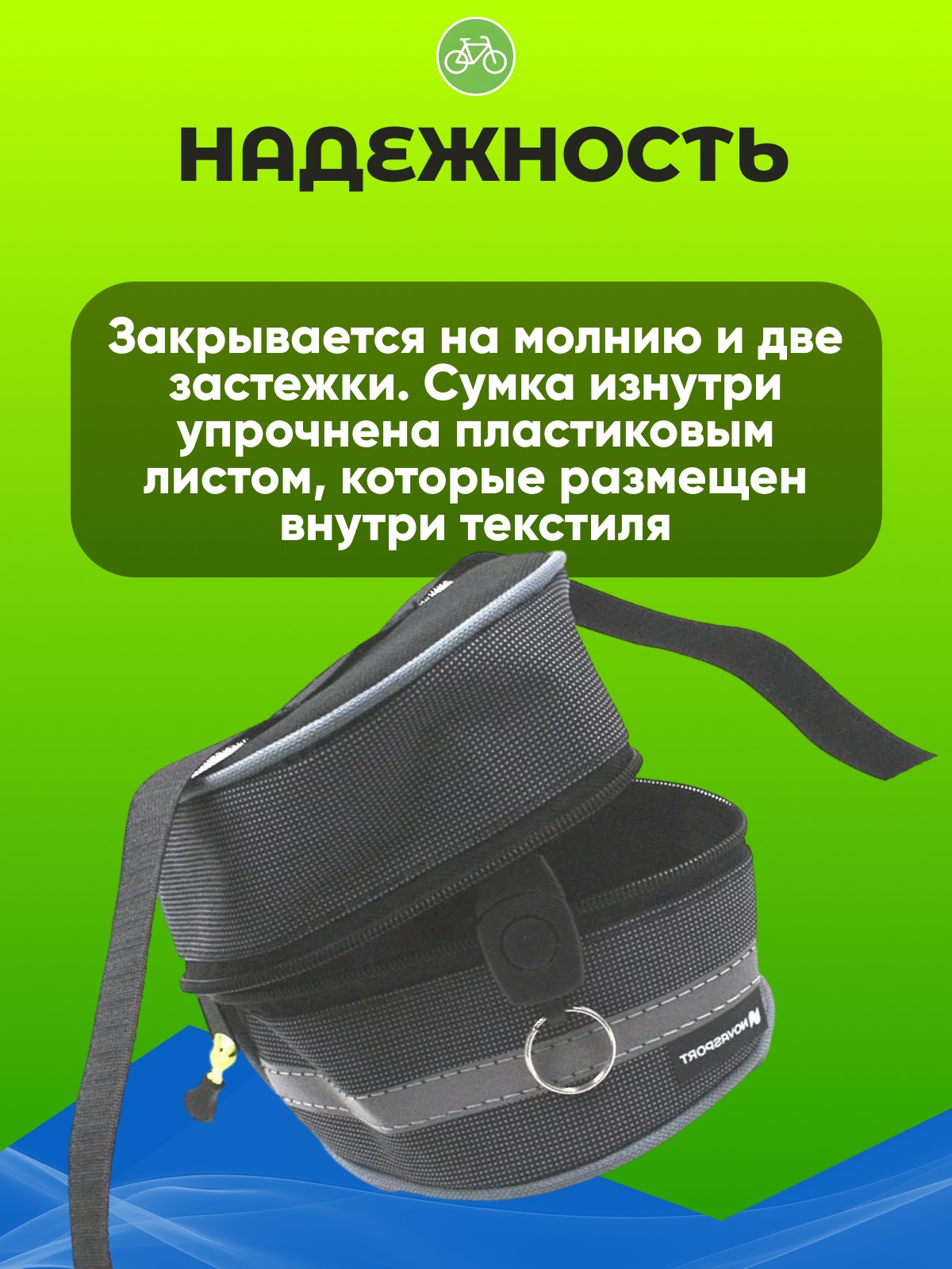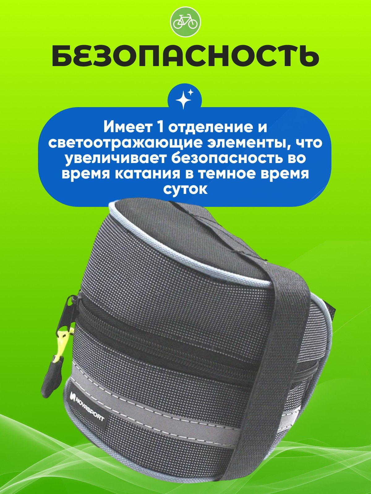 Велосумка под седло средняя BC 064 - бюджетная сумка средних размеров, которая крепится под седло с помощью липучек. Имеет 1 отделение и светоотражающие элементы, что увеличивает безопасность во время катания в темное время суток. Закрывается на молнию и две застежки. Сумка изнутри упрочнена пластиковым листом, которые размещен внутри текстиля.