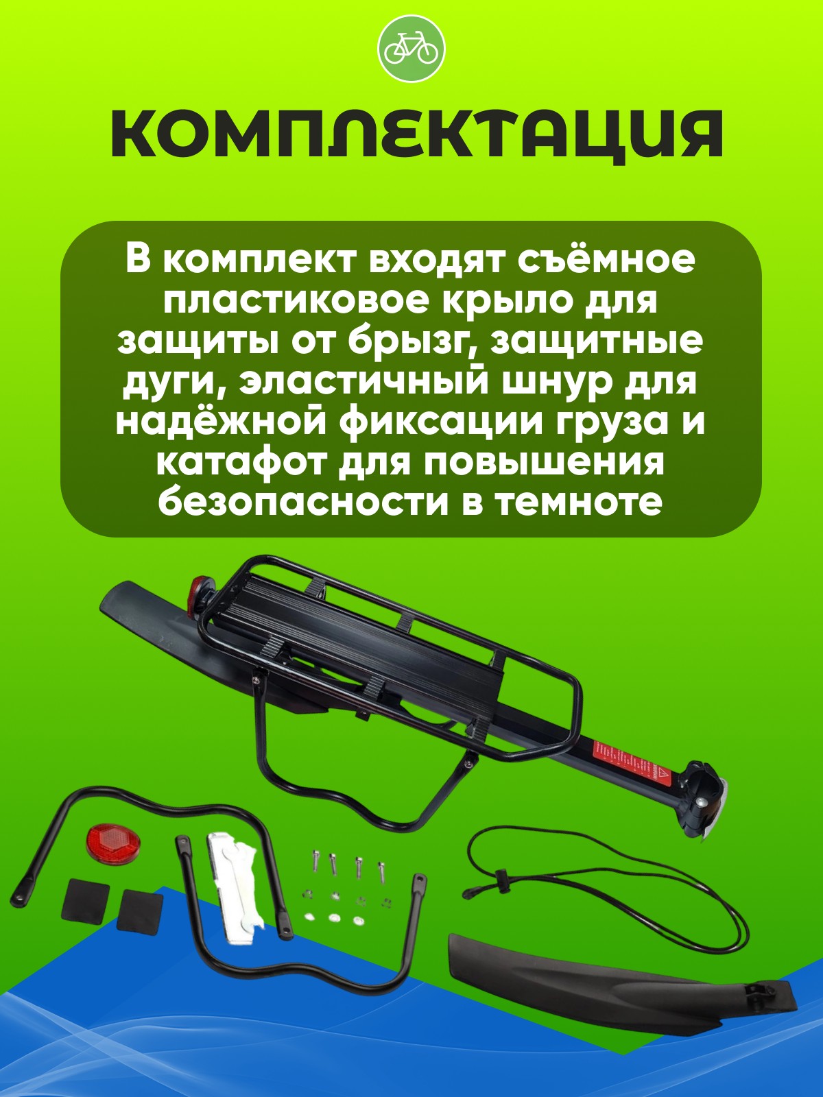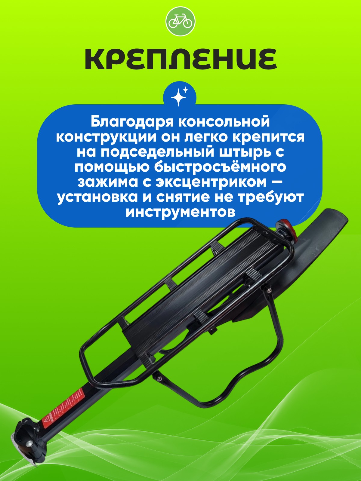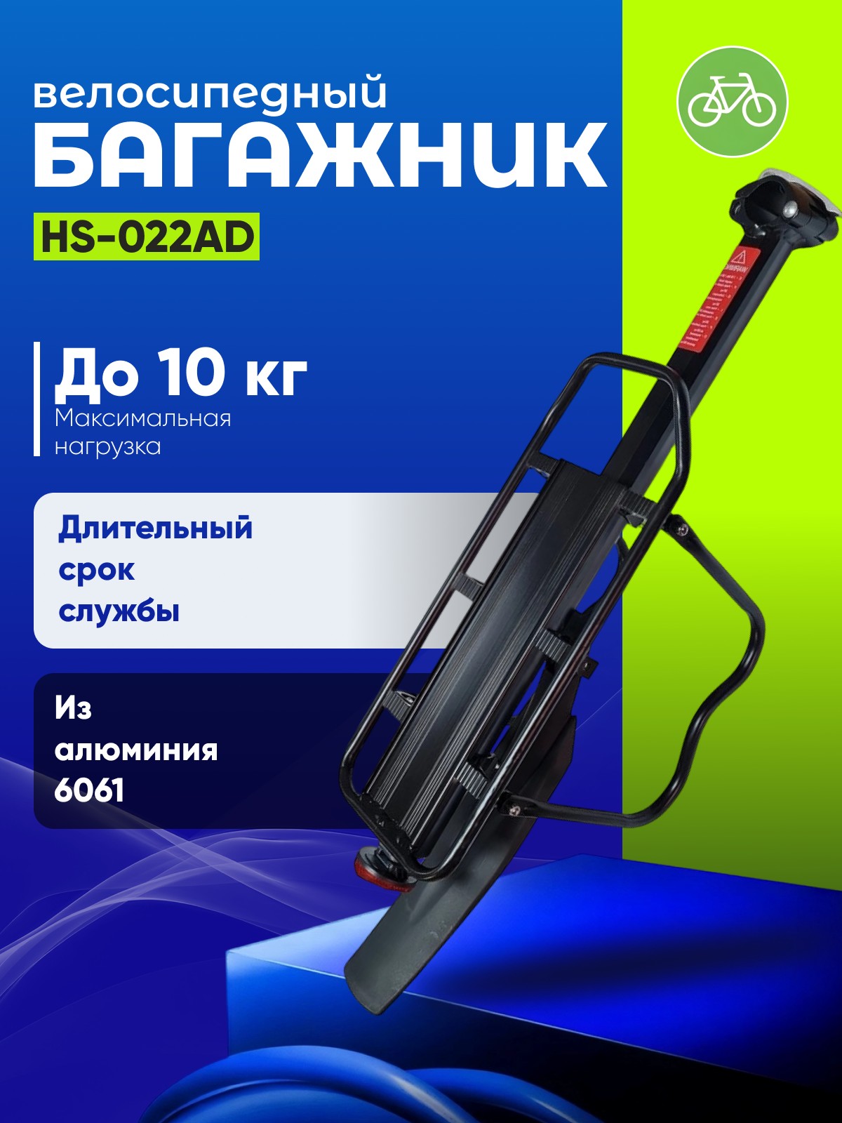 Велосипедный багажник HS-H022AD — практичное и функциональное решение для городских и туристических поездок. Благодаря консольной конструкции он легко крепится на подседельный штырь с помощью быстросъёмного зажима с эксцентриком — установка и снятие не требуют инструментов. Изготовлен из лёгкого и прочного алюминиевого сплава 6061, выдерживает нагрузку до 10 кг. В комплект входят съёмное пластиковое крыло для защиты от брызг, защитные дуги, эластичный шнур для надёжной фиксации груза и катафот для повышения безопасности в темноте. Вес багажника — около 1 кг, что делает его удобным даже для лёгких велосипедов.