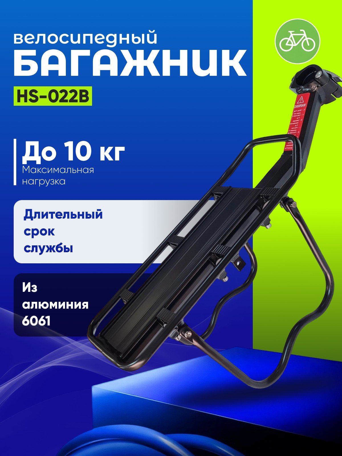 Лёгкий и прочный багажник HS-022B из алюминиевого сплава выдерживает до 10 кг груза. Быстрое крепление к подседельному штырю, в комплекте — шнур для фиксации и катафот. Идеален для повседневных поездок и путешествий.