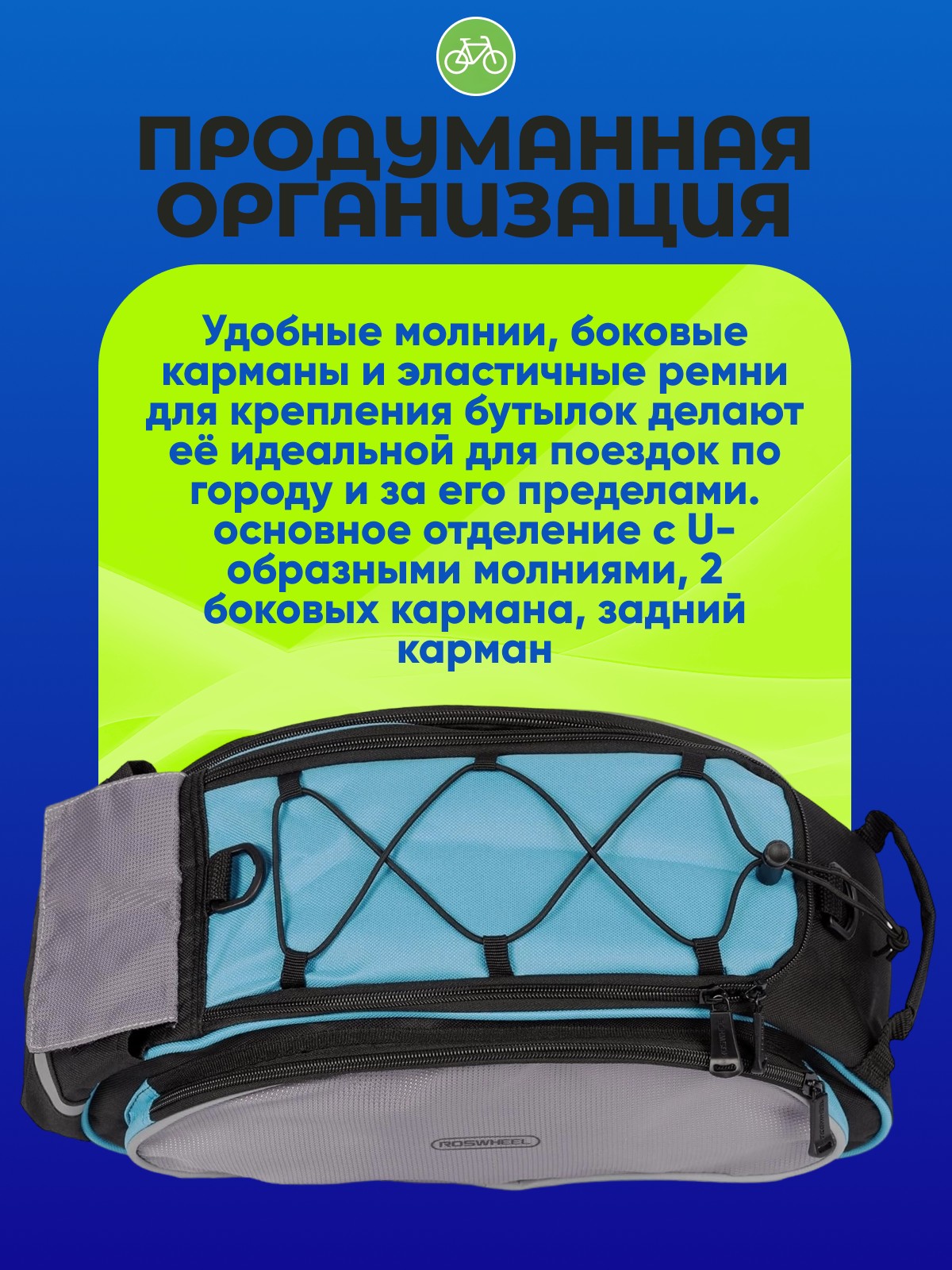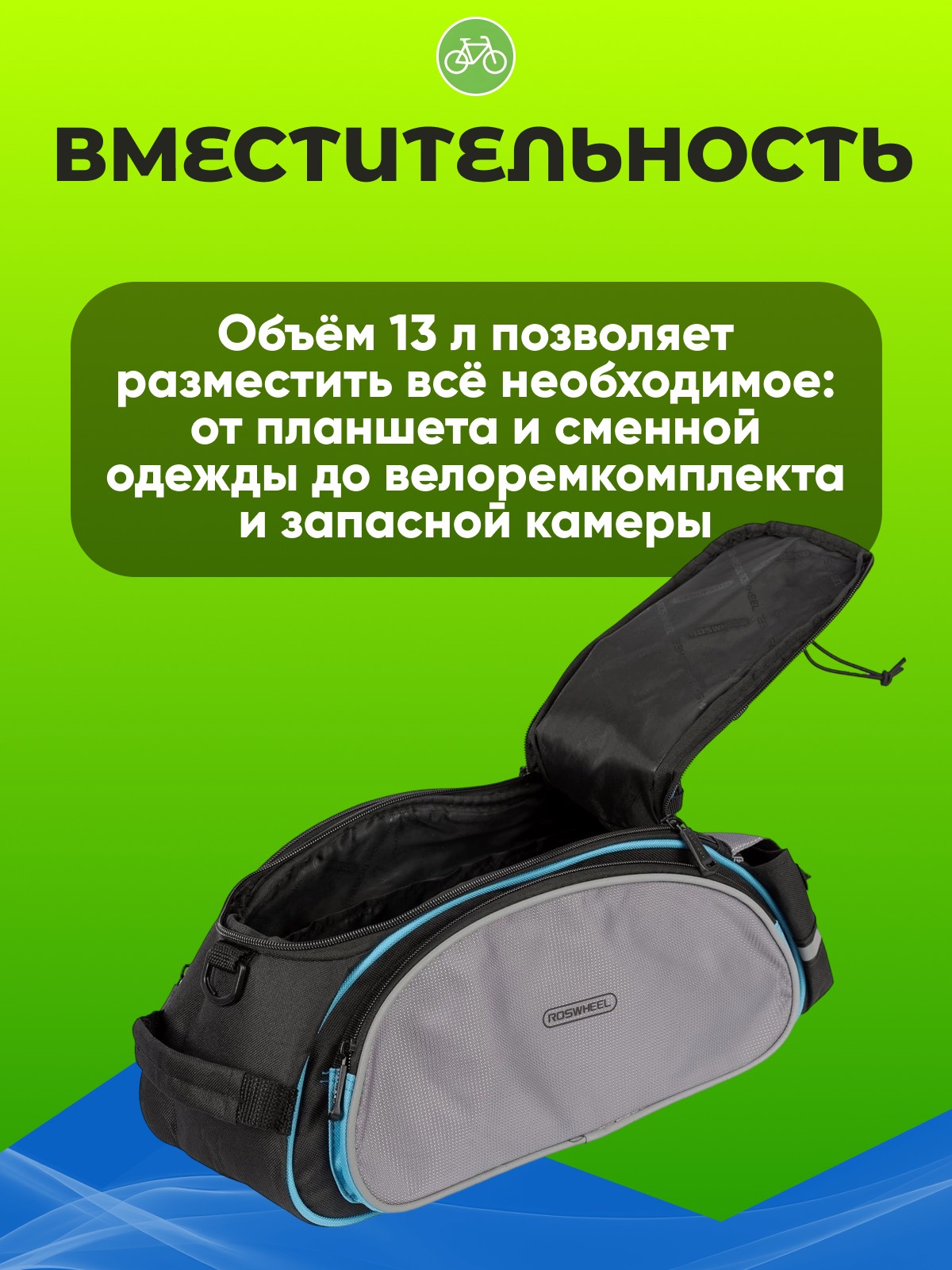 Велосумка Roswheel 14541 — практичное и стильное решение для велосипедистов, ценящих комфорт и функциональность. Объём 13 л позволяет разместить всё необходимое: от планшета и сменной одежды до велоремкомплекта и запасной камеры. Сумку можно использовать не только на багажнике, но и носить через плечо или в руках. Прочный полиэстер 600D сохраняет форму даже при полной загрузке, а светоотражающие элементы повышают безопасность в тёмное время суток. Удобные молнии, боковые карманы и эластичные ремни для крепления бутылок делают её идеальной для поездок по городу и за его пределами.