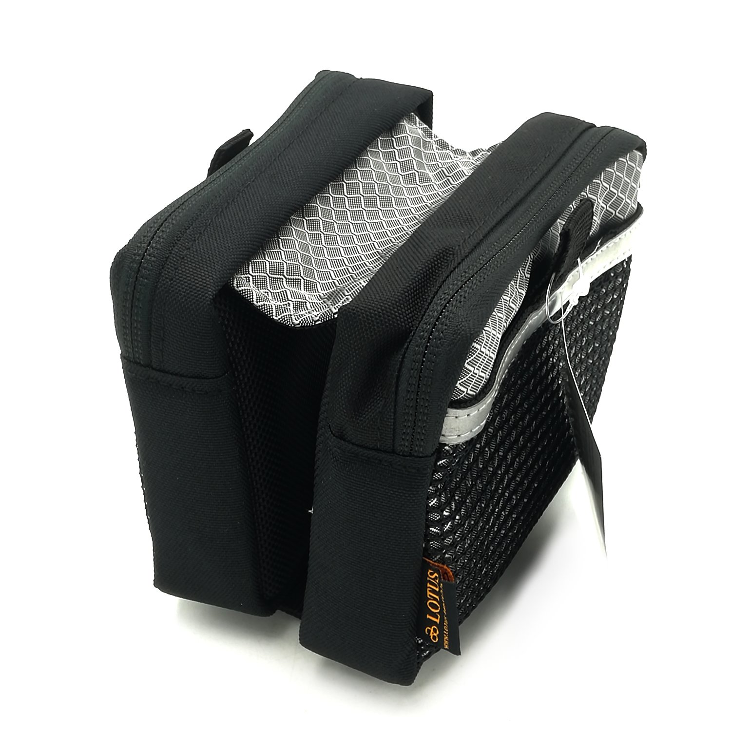 - Два основных отсека по бокам рамы + по одному сетчатому карману с каждой стороны