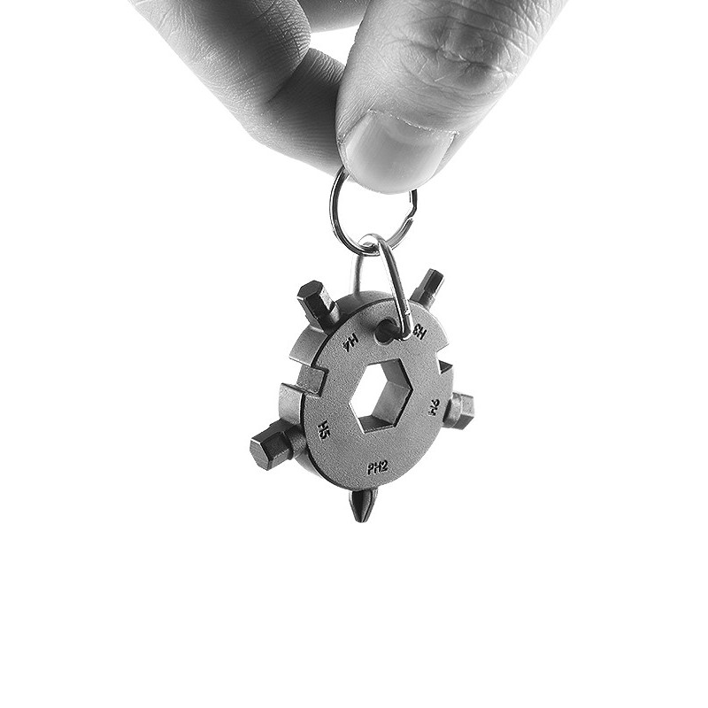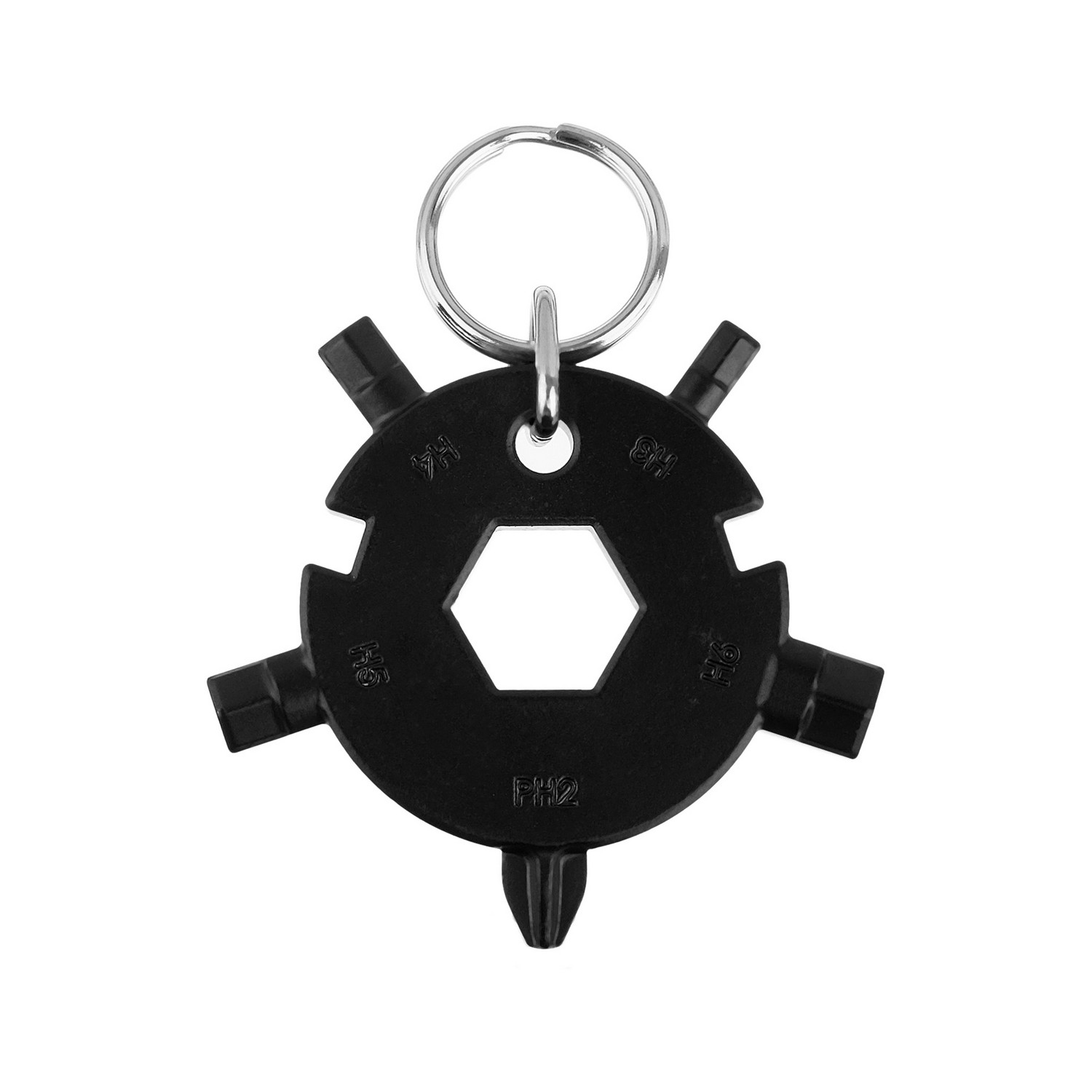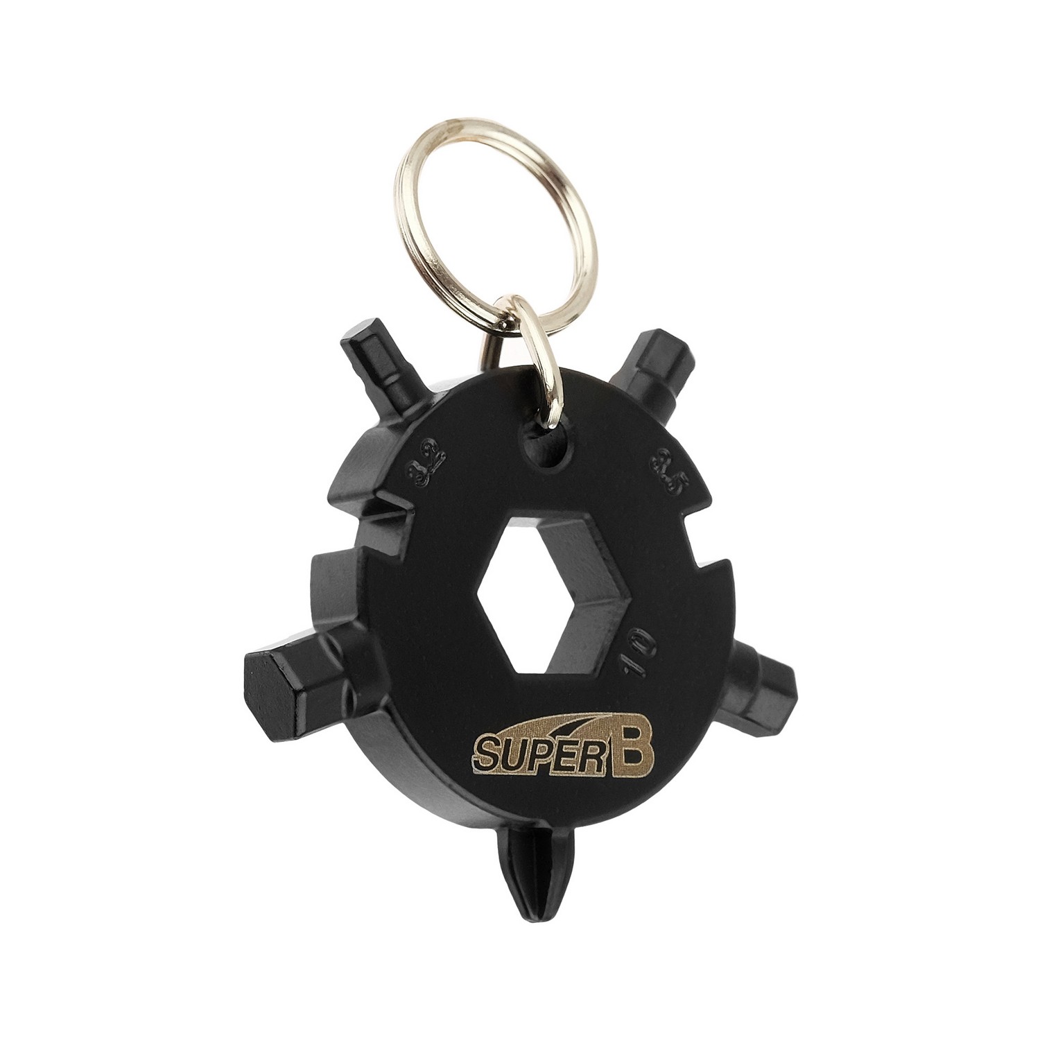 Super B TB-FD08 — ультракомпактный многофункциональный ключ-брелок, который всегда будет под рукой благодаря возможности крепления к связке ключей. Размером с обычный брелок, он объединяет 9 полезных функций для базового ремонта и настройки велосипеда: четыре шестигранника, крестообразную отвёртку, гаечный ключ, спицевой ключ и кольцо для крепления. Изготовлен из прочного стального сплава, устойчив к износу и коррозии. Легко помещается в карман, велосумку или рюкзак — идеален для ежедневных поездок, путешествий и неожиданных поломок в дороге.