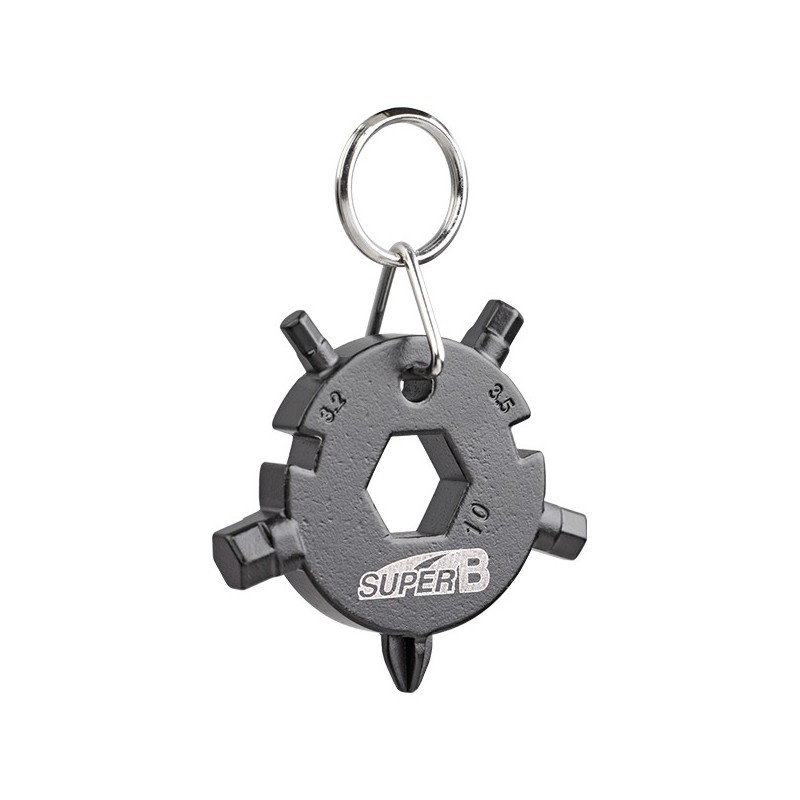 Super B TB-FD08 — ультракомпактный многофункциональный ключ-брелок, который всегда будет под рукой благодаря возможности крепления к связке ключей. Размером с обычный брелок, он объединяет 9 полезных функций для базового ремонта и настройки велосипеда: четыре шестигранника, крестообразную отвёртку, гаечный ключ, спицевой ключ и кольцо для крепления. Изготовлен из прочного стального сплава, устойчив к износу и коррозии. Легко помещается в карман, велосумку или рюкзак — идеален для ежедневных поездок, путешествий и неожиданных поломок в дороге.