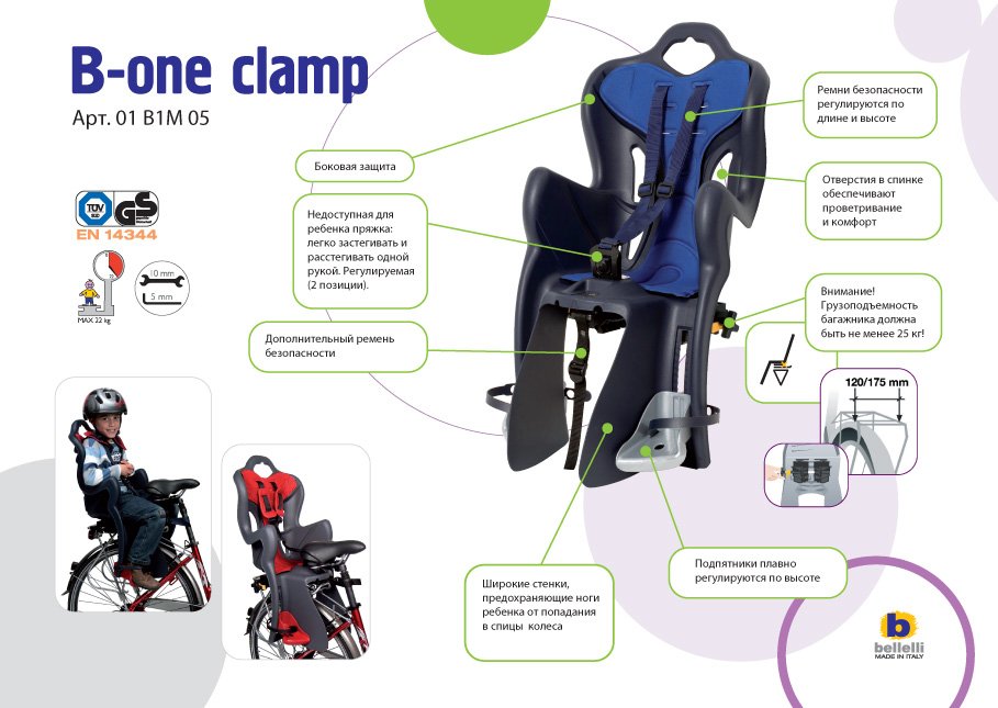 Детское кресло Bellelli B-One Clamp - качественное итальянское кресло для вашего ребенка. Выполнено из пластика. Ремешки регулируются по длине, а подпятники регулируются по высоте, благодаря чему кресло настраивается индивидуально под ребенка. Кресло оснащено специальной съемной мягкой вкладкой, которую можно стирать. Широкая защита ног исключает контакт ребенка со спицами колеса. Спинка вентилируема, что спасет малышка в жаркий день. Кресло выдерживает до 22 кг.