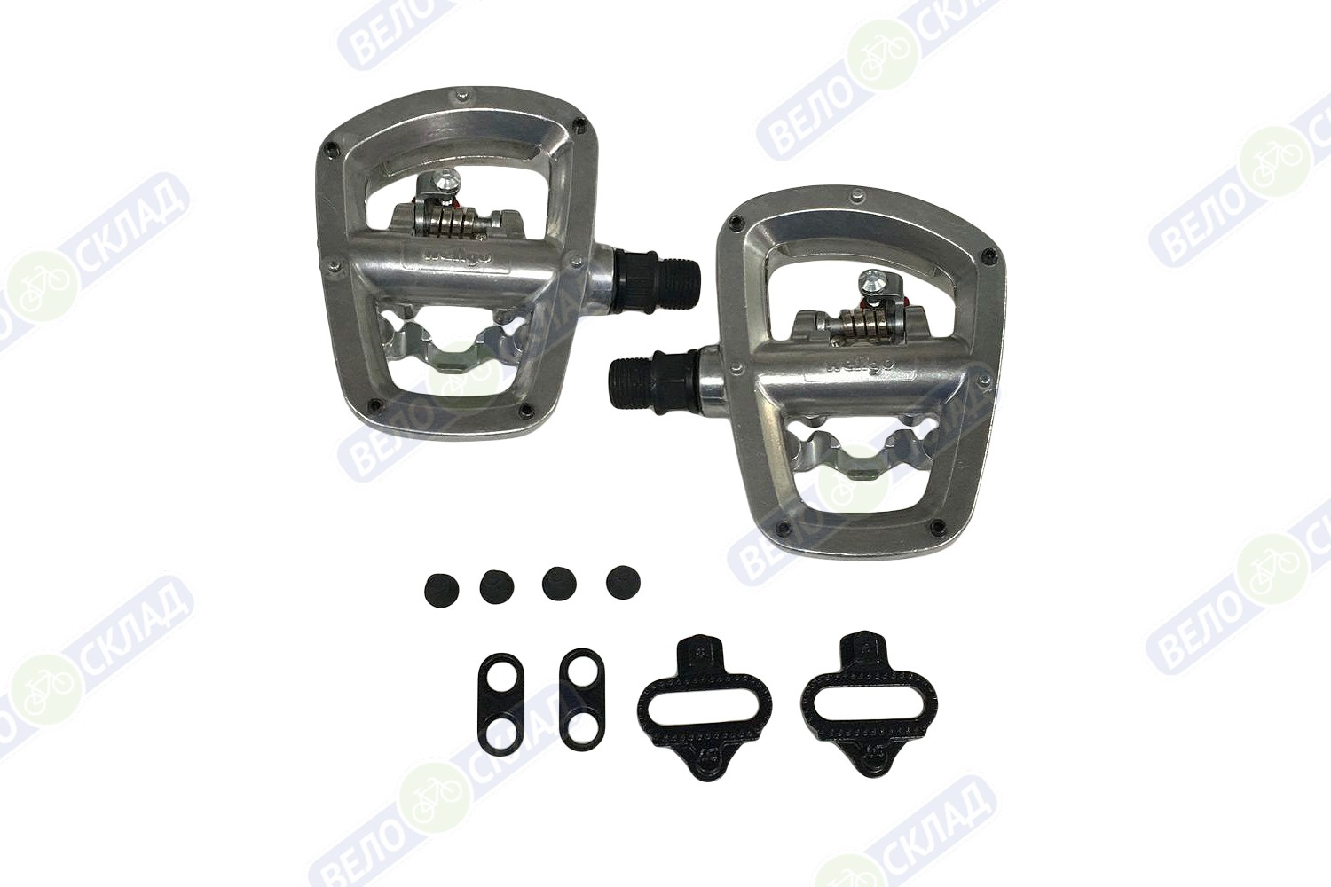Wellgo W-43 - это качественные контактные педали с системой встегивания SPD от Shimano. Подойдут для установки на городские и туристические велосипеды. Платформа выполнена из алюминиевого сплава, а ось - из хром-молибдена. Педали укомплектованы надежными подшипниками радиально-игольчатого типа. Резьба: 9/16 дюймов. Вес пары педалей - 396 грамм. Размеры: 90 х 100 х 32,5 мм. Цвета: серебристый, черный.