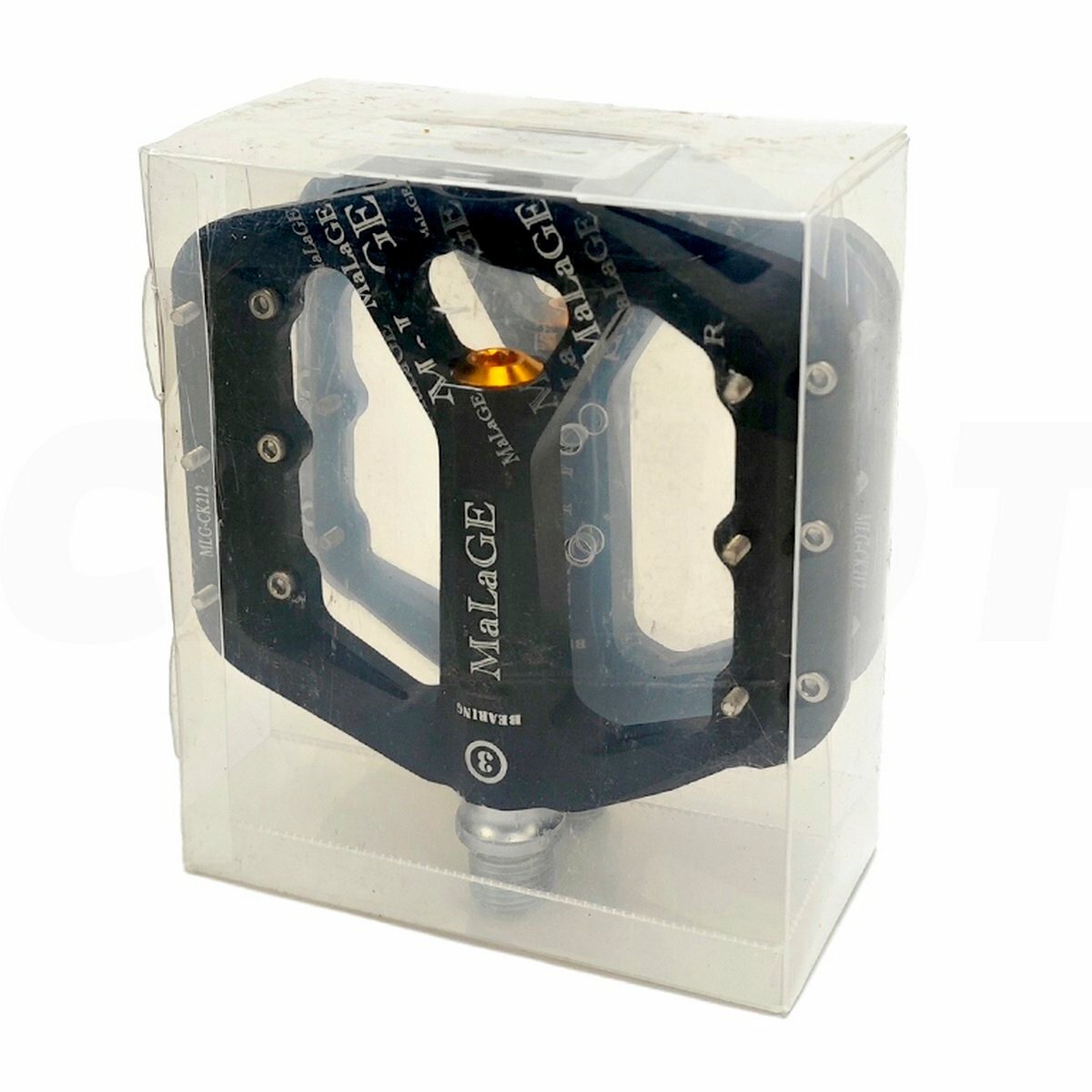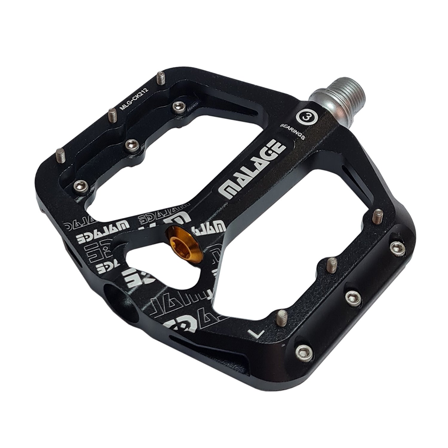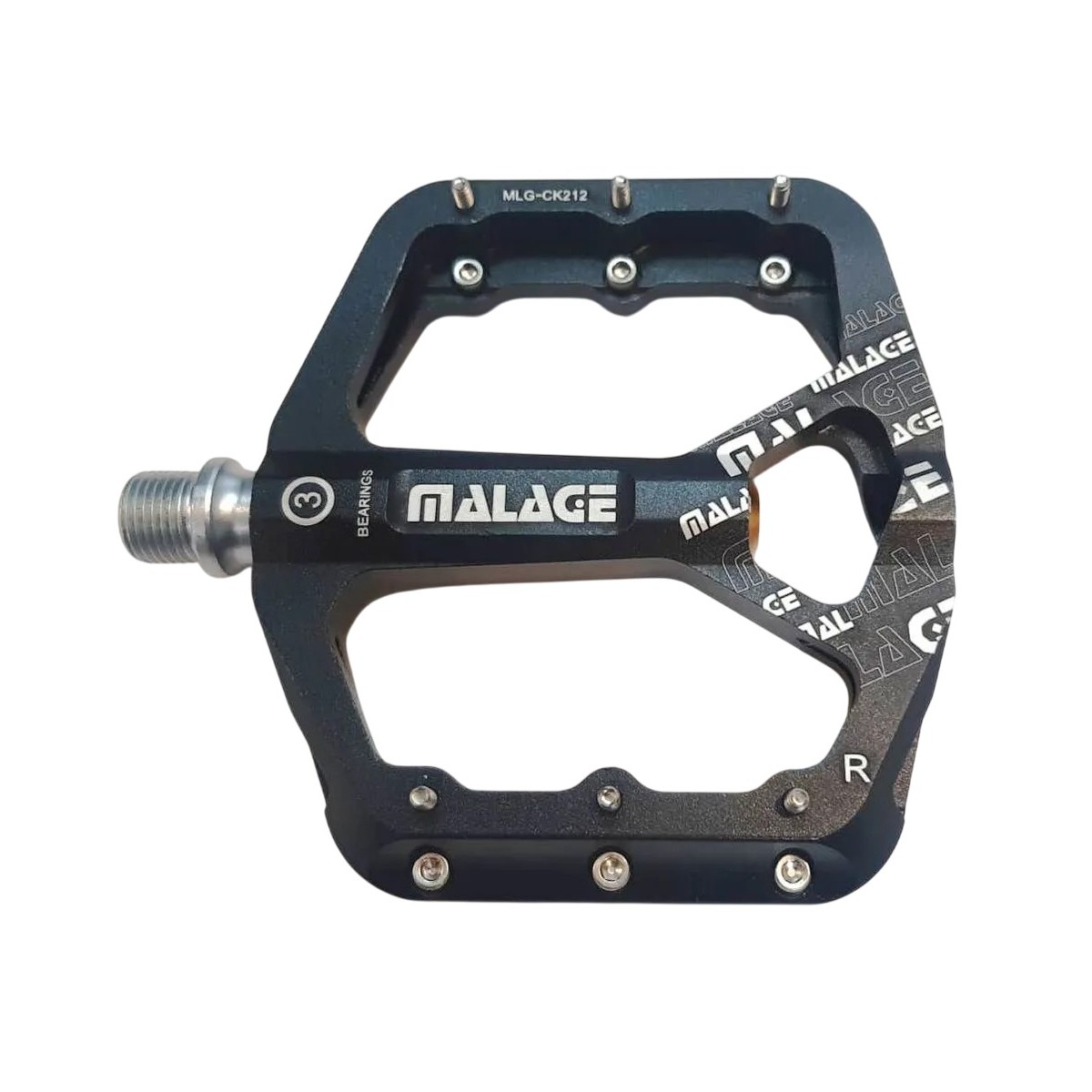 Педали MalaGe MLG-CK212 — прочные и надёжные платформенные педали для горных велосипедов, разработанные для езды по сложному рельефу и агрессивного катания. Корпус выполнен из фрезерованного алюминия, что обеспечивает высокую жёсткость и устойчивость к ударам. Размер платформы — 100 × 110 мм, благодаря чему стопа надёжно фиксируется даже в движении. Ось из хром-молибденовой стали с резьбой 9/16″ гарантирует долговечность и совместимость со всеми стандартными шатунами. В конструкции использованы 3 промышленных подшипника для плавного вращения, они надежно защищены от пыли и влаги. Для максимального сцепления с обувью предусмотрены сменные шипы — по 6 с каждой стороны (всего 12 шт. на одну педаль).